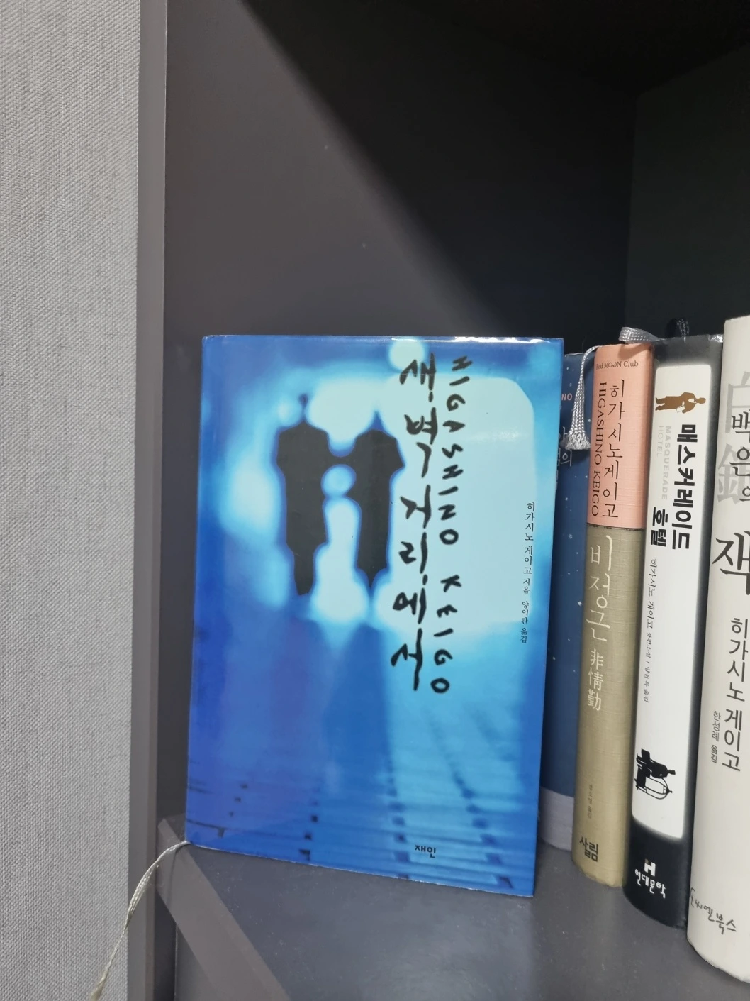 저는 이 책 표지를 넘기고 딱 한 페이지 읽었는데 그날 하루만에 다 읽었습니다. 몇 번이나 다시 봤구요, 스토리를 이렇게 문장으로 표현할 수 있구나, 란 생각도 하게 되었습니다. 특별히 추리소설이라는 장르에 집착하지 않고 그때부터 그저 히가시노 게이고님의 책이라고 하면 사서 읽었던 것 같아요. <예지몽>, <나미야 잡화점의 기적>, <붉은 손가락> 등등 폭풍처럼 책을 읽었습니다. 히가시노 게이고 작가님 얘기가 나와서 그런데 제가 개인적으로 애정하는 그분의 작품은 <새벽 거리에서>란 책입니다.