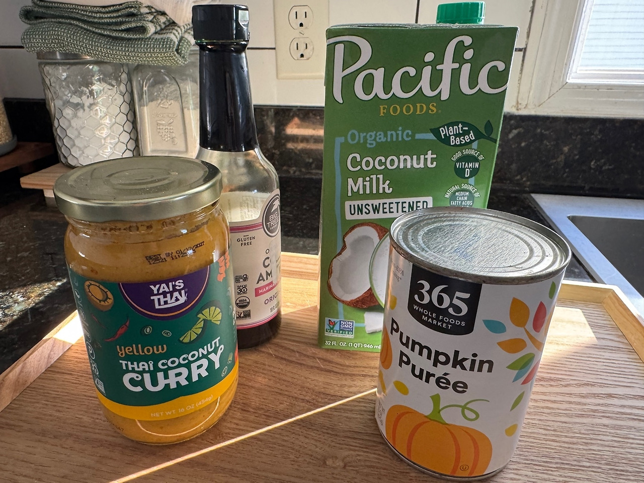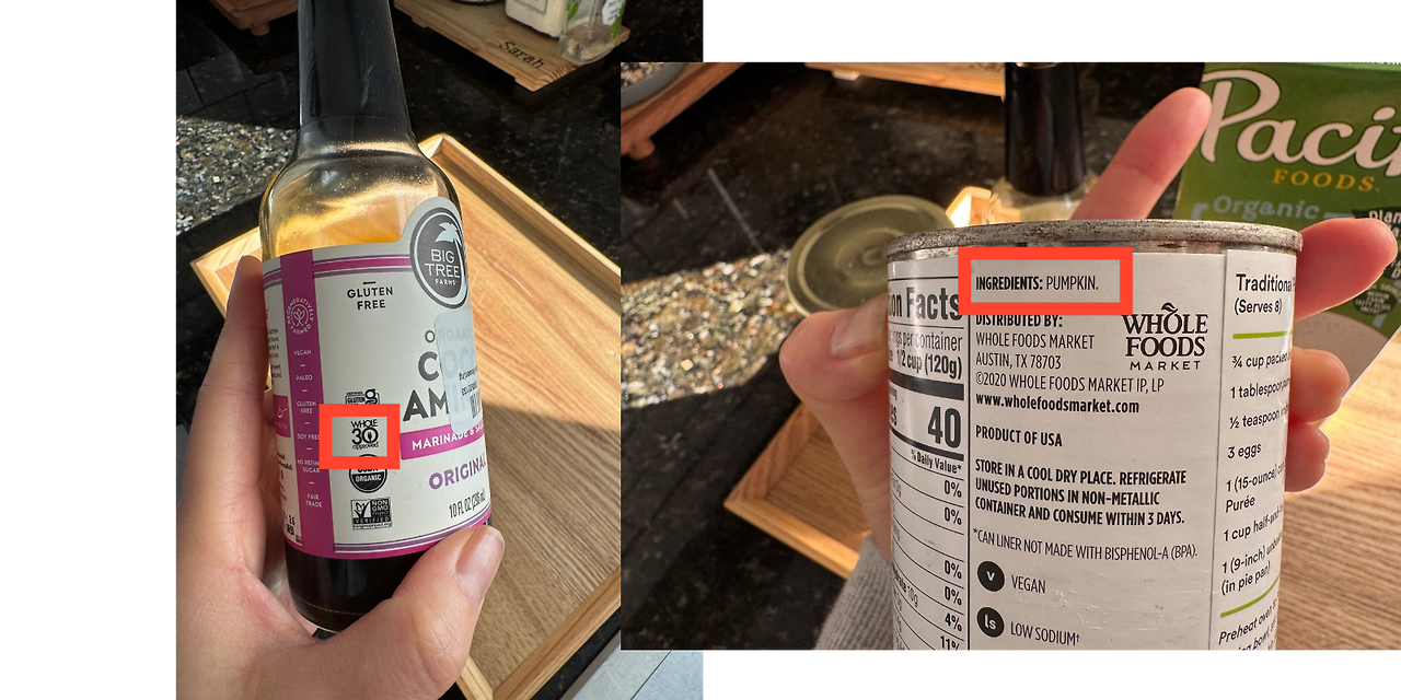 라벨에 Whole 30 승인 마크가 있는 코코넛아미노스 - Igrediant에 Pumkin 만 있는 Pumkin Puree 캔 성분 확인