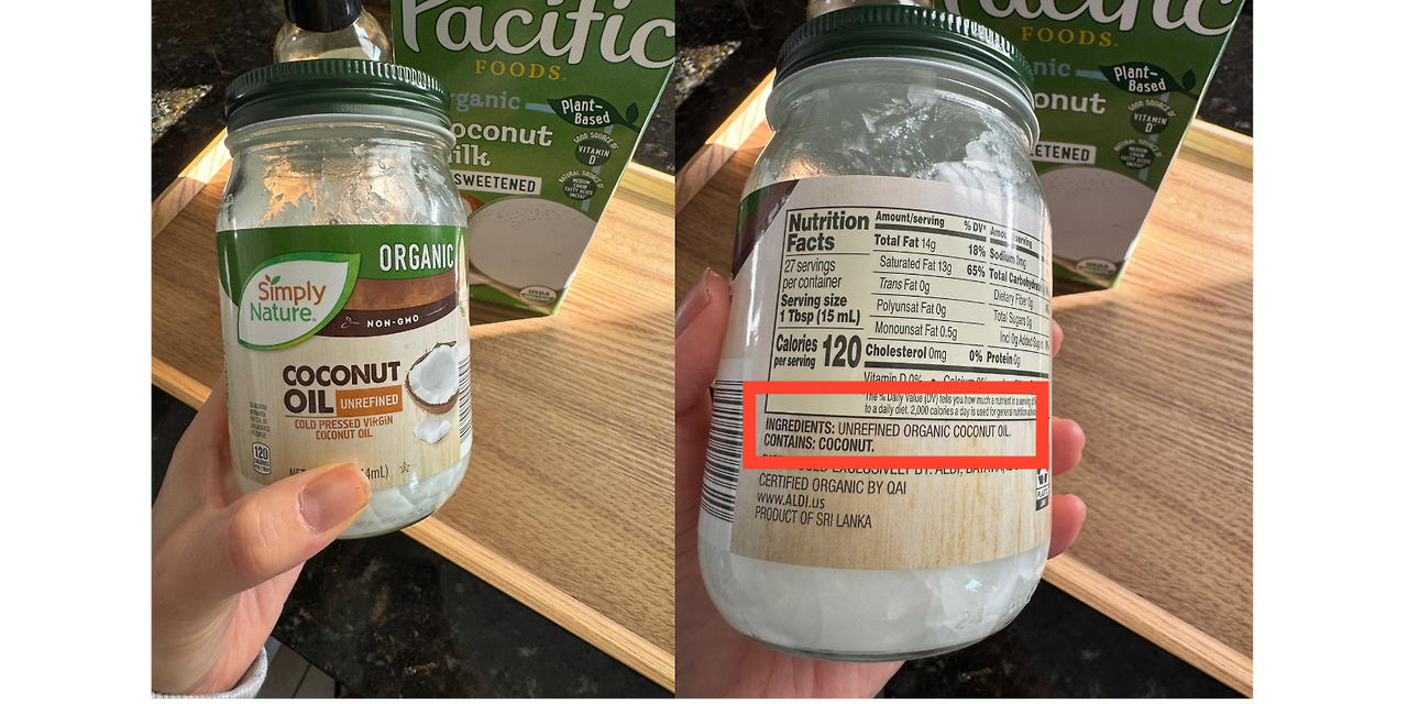 COCONUT OIL의 성분 확인 : 설탕이나 추가 첨가물 없음