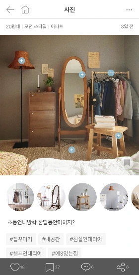 '오늘의집'은 한마디로 인테리어에 필요한 가구, 소품, 인테리어 자재를 판매하는 서비스다. 그들의 마케팅 핵심은 바로 소비자가 인테리어한 공간 이미지들로 그들의 제품을 프로모션 하는 것이다. 이쁘게 꾸며진 집의 이곳저곳 공간들과 전세, 월세로 보이는 원룸방 사진들. 사진 속 태깅되어 있는 가구와 소품들은 모두 큰 맘 먹지 않아도 구매할 수 있는 가격대를 구성한다.