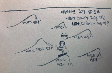 다시금 누군가 나에게 마케터를 한마디로 정의가 무엇이냐고 묻는다면 '마케터는 서퍼(Surfer)다'라고 표현하고 싶다. 마케팅에도 큰 흐름, 물결이 있는데 내 앞으로 다가오는 크고 작은 물결을 타며 그 안에서 중심을 잡으며 자신만의 물길을 내는 전문가 말이다. 물결은 그 마케터가 속한 사회의 시대상, 소비자의 특성으로 하여금 쉴 새 없이 만들어진다. 물길을 잘못 타서 설령 떨어지더라도 괜찮다. 다시 보드 위로 올라가 다시금 무게중심을 잡고 끊임없이 다가오는 새로운 물결을 타면 그만이니까. 오히려 많이 떨어져 본 서퍼가 파도를 탈 때 더 여유 있는 법이니까.