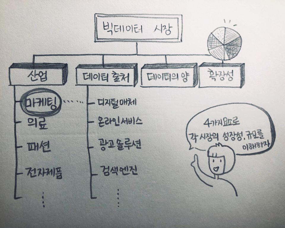 위 질문에 답을 구하기 위해 빅데이터 시장을 잘게 쪼개서 살펴보자. 빅데이터 시장을 세분화, 각 시장의 규모와 성장성을 가늠해볼 수 있는 요소로 4가지 요인 - 산업(Industry), 데이터의 공급처(Data Resource), 데이터의 양(Data Scale) 그리고 확장성(Scalability)이 있다.