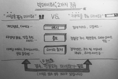 하지만 이 글을 통해 나는 살짝 다른 이야기를 하고자 한다. 빅데이터의 정확한 실체 - 막연한 환상과 기대가 아닌 빅데이터라는 녀석을 직접 만져본(?) 사람만이 느낄 수 있는 감정과 시선들에 대해서 말이다. 현재 다양한 산업군에서 빅데이터를 적용해나가는 양상이지만 내가 종사하고 있는 '마케팅'으로 한정시킨 생각이라는 점을 전제로 말씀드리고자 한다.
