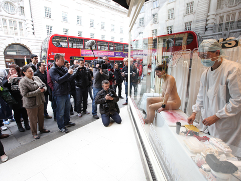 영국 러시 매장에서 진행한 동물실험 반대 캠페인의 모습. 때로는 침묵으로 더 큰 울림을 주는 방법도 잊지 말자. / 출처 : 구글 검색 결과