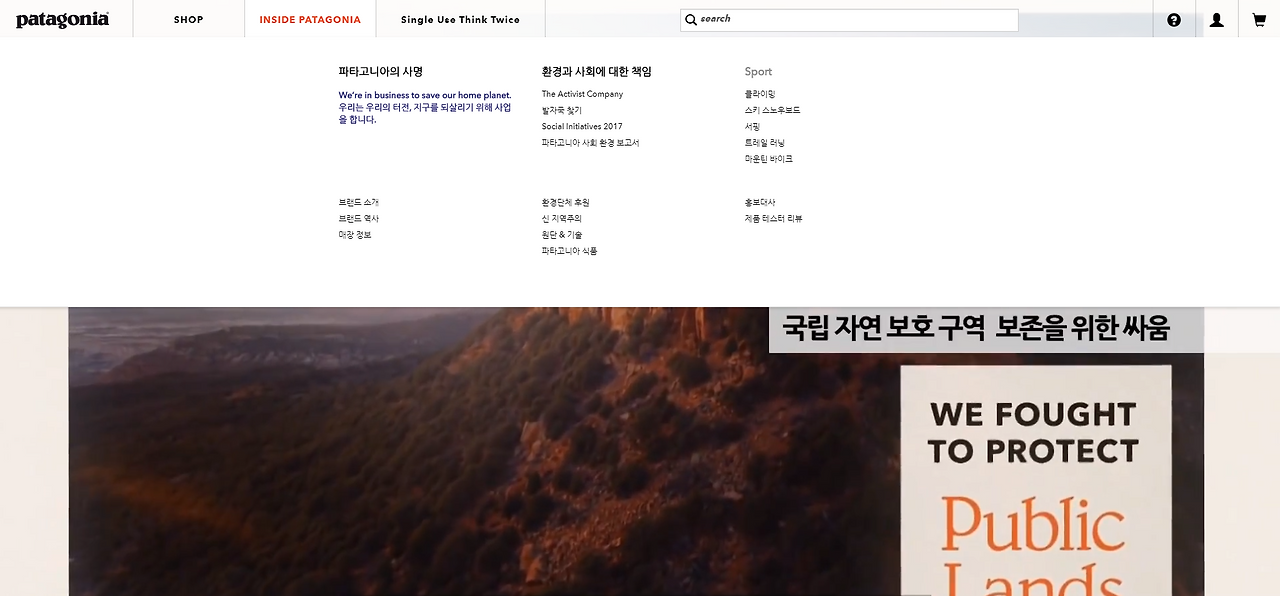 파타고니아 홈페이지는 자신들의 환경보호와 관련된 캠페인을 자세하게 소개하고 있다. / 출처 : 파타고니아 홈페이지