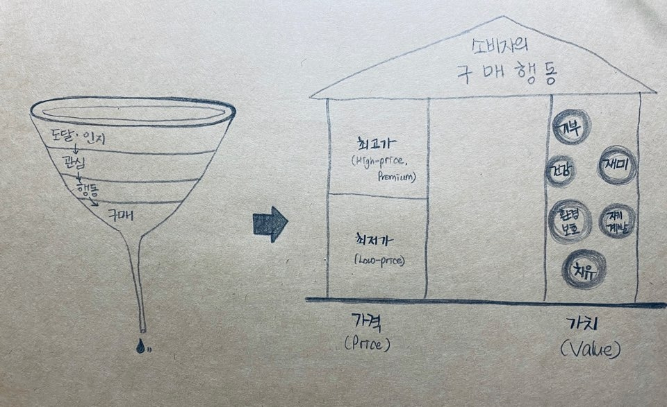 소비자가 어떤 상품을 구매하고자 할 때, 크게 두 가지 경로를 떠올리고 그중 하나를 선택하게 된다. 첫 번째 축은, 소비자에게 [가격] 요소가 민감하게 작동하는 브랜드·제품 카테고리가 있고, 또 다른 축은 [가치] 요소가 상대적으로 더 강력하게 연결되어 구매하는 경우가 있다.