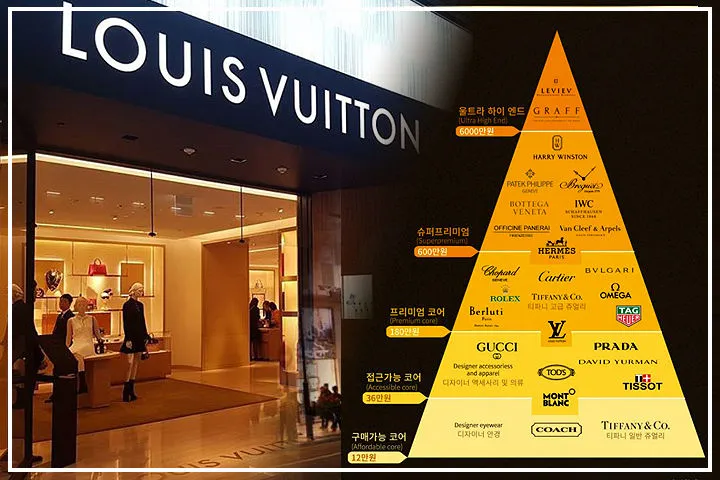 마케터라면 한 번쯤 명품 피라미드 구조도를 접한 적이 있을 것이다. 명품 브랜드 가격대에 따라 계급(Hierchy)을 형성하고 있다. 이 프레임은 소비자 소득 수준에 따라 명품 브랜드를 정말 계층적으로 구매할까라는 궁금증으로 이어진다.