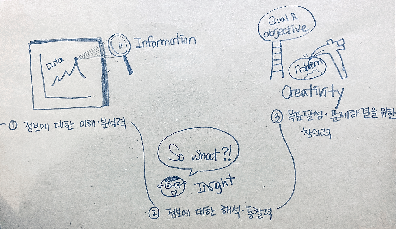 전략적 사고를 훈련시키는 3가지 과정 : 정보에 대한 이해, 정보를 해석하는 통찰, 그리고 데이터를 기반한 창의력.