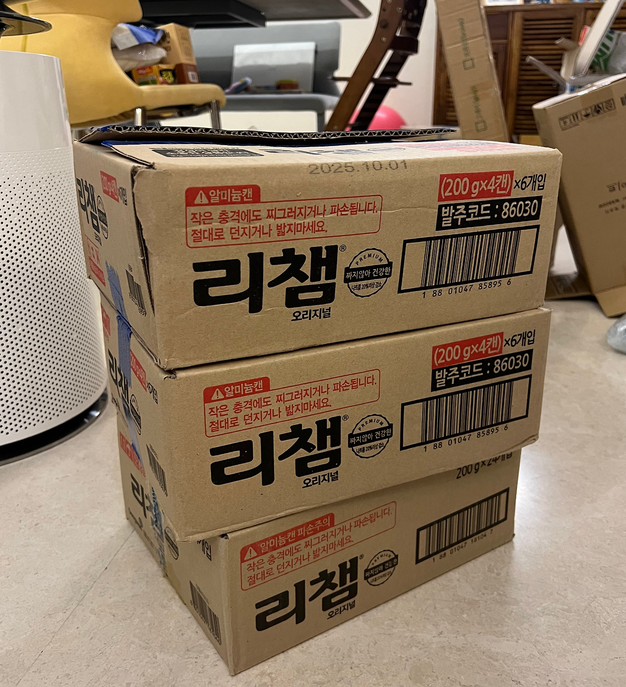 도착한 리챔. 내 평생 이렇게 많은 통조림 햄을 살 줄이야. 보는 것만으로 든든하다. <오른쪽 이미지 출처: 동원몰>