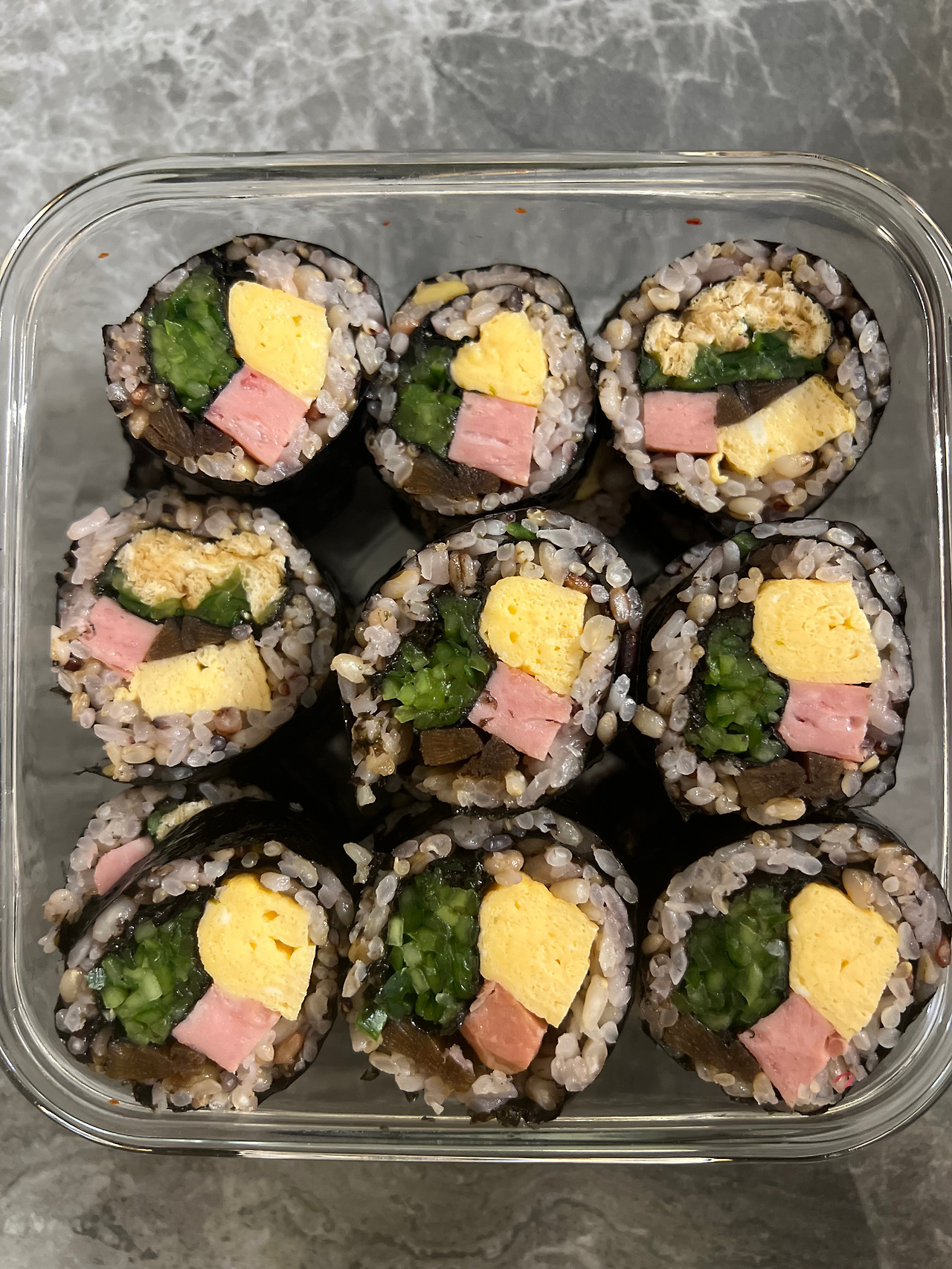 달걀, 오이, 리챔, 우엉을 넣은 집김밥