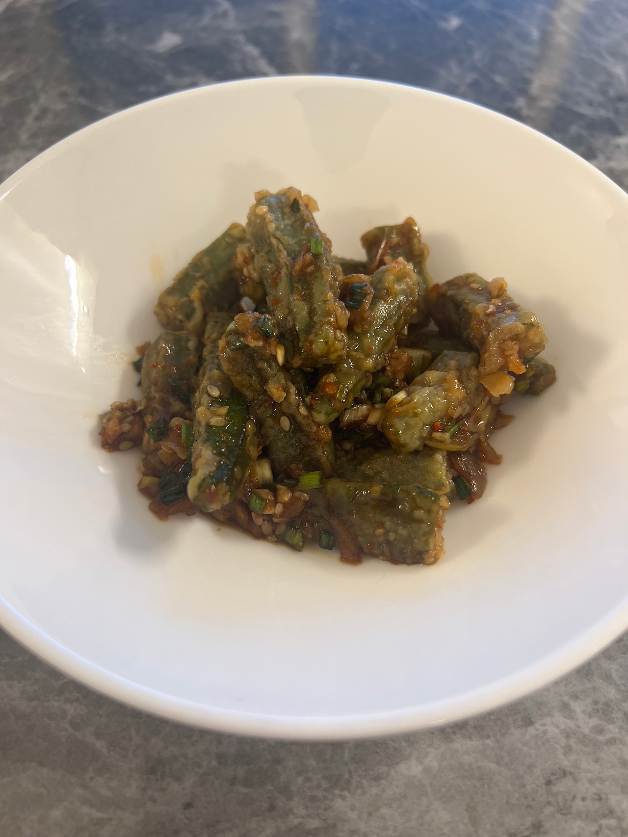 무쳐 놓고 보니 모양새는 꽈리고추찜과 정말 똑같다. 하나 집어 얼른 맛보았다. 그런데 의외의 식감이다. 처음 씹을 때는 아삭하고 끝에 씹히는 느낌은 부드럽다. 레이디핑거가 꽤 단단한 편이라 스팀으로 쪄 냈어도 아삭하고, 안의 끈적끈적한 진액이 부드러운 식감을 만들어 주는 듯했다. 그렇지만 간장 양념장에 무쳤으니 맛은 완전한 한식 밑반찬이었다. 생김새는 영락없는 꽈리고추찜이라 눈이 먼저 속는다. 식감은 아삭하고 맛은 상큼해서 꽈리고추찜에 기대한 바는 아니었지만, 이건 꽈리고추찜을 흉내 낸 밑반찬이 아닌 아예 새로운 다른 반찬이다. 그러니 꽈리고추찜을 먹지 못했어도 괜찮아졌다. 밑반찬 하나를 새로 개발했으니 너무나 기쁘다. 생으로 썰어서 아삭이 고추 된장무침을 만드는 것처럼 된장에 무쳐 먹어도 잘 어울릴 것 같다. 이렇게 순식간에 반찬 두 개를 개발했다.
