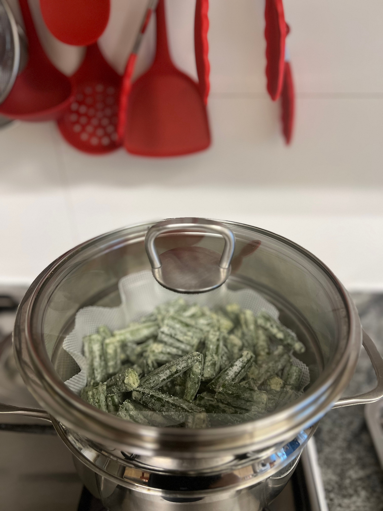 ‘오크라’로도 알려진 ‘레이디핑거’는 인도에서 흔히 구할 수 있는 채소다. 언뜻 보면 풋고추와 비슷하게 생긴 레이디핑거는 갈라 보면 정말 고추처럼 씨도 있고 상큼한 향도 난다. 이 정도면 꽈리고추라고 눈이 속아줄 수는 있겠다. 나는 꽈리고추찜 레시피를 검색해 그대로 만들었다. 잘 씻은 레이디핑거에 찹쌀가루를 묻혀 김을 올린 찜기에 쪄 내고, 간장, 파, 마늘, 고춧가루로 만든 양념장을 버무려 무쳤다.