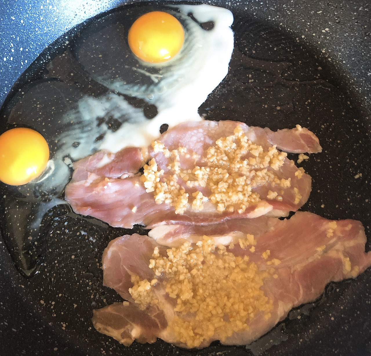 베이컨 두장을 팬에 올리고 위에 간 마늘을 소스처럼 얹어 강불로 구워요. 항상 아는 그 맛이 질릴 때면 향신료를 쓰는 게 정답일 터인데, 간 마늘만큼 편하고 흔한 향신료도 없으리란 생각이었습니다.