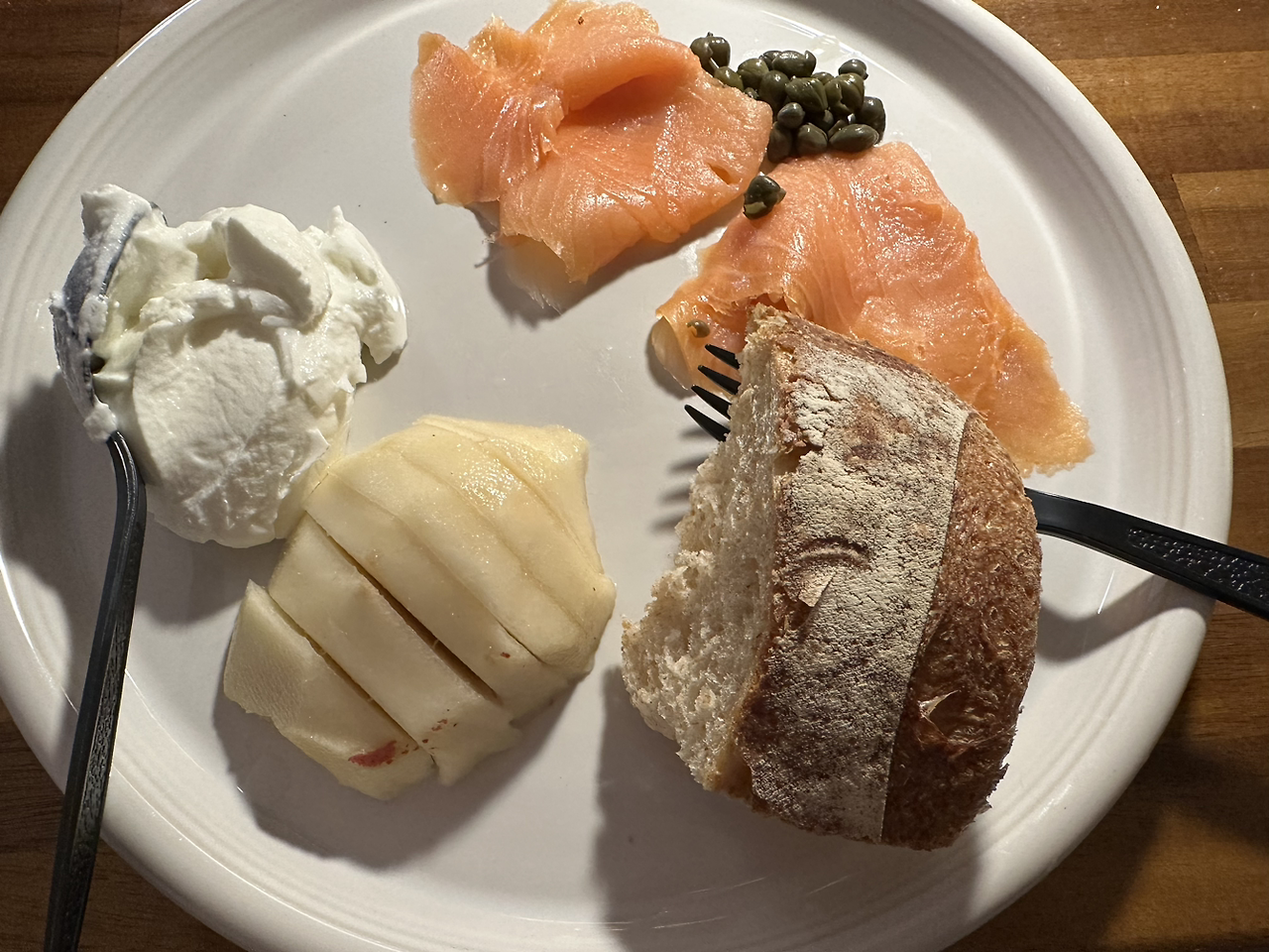 이 메뉴는 이 지역의 유명한 베이커리인 Acme 베이커링 르뱅과 훈제연어, 서양배(레드페어가 맛있음), 마담로익 치즈다. 이렇게 먹으면 양이 적은 중국식 팥빵이나 딤섬보다 몸무게가 안 오르는 게 신기함.