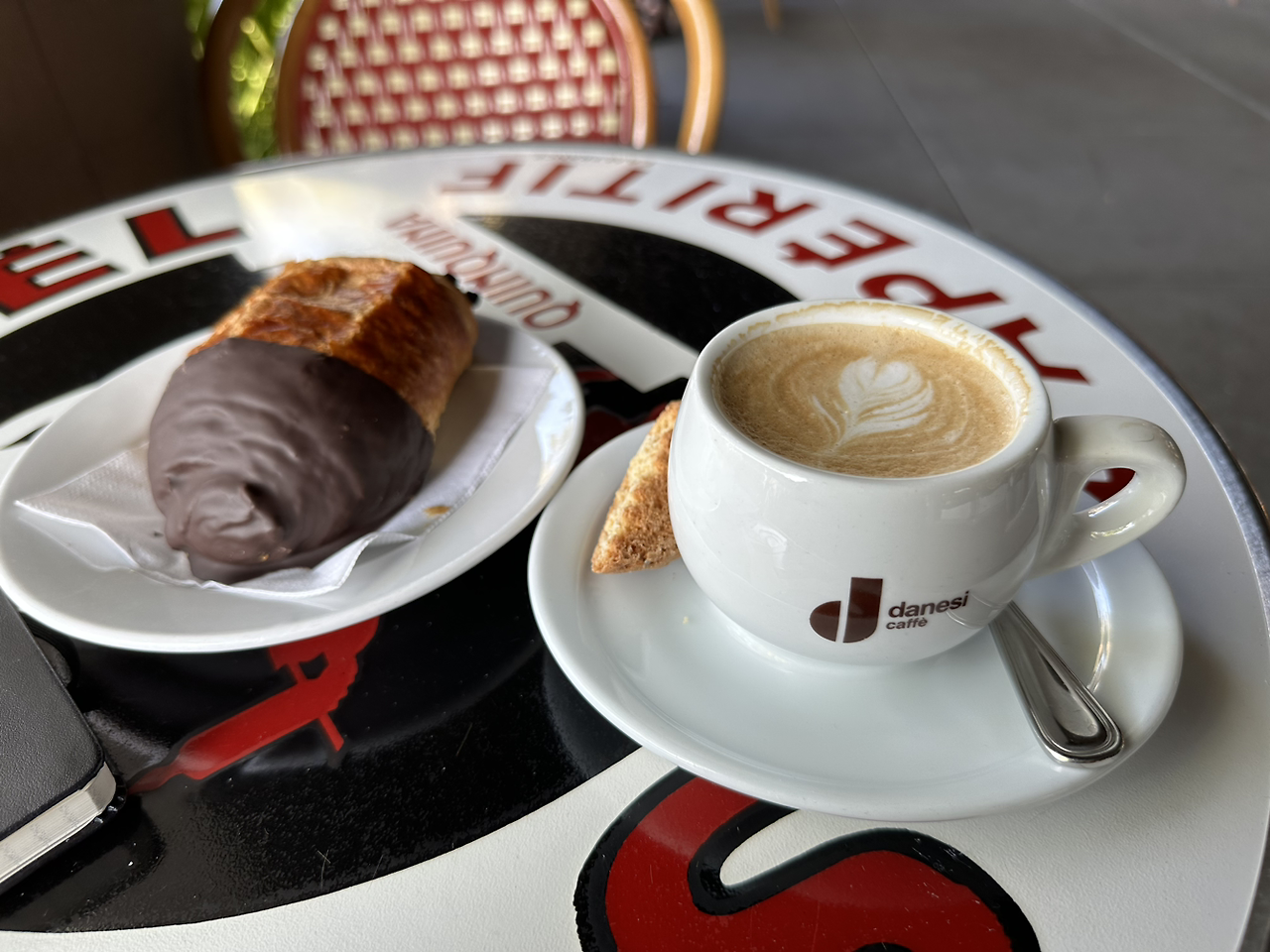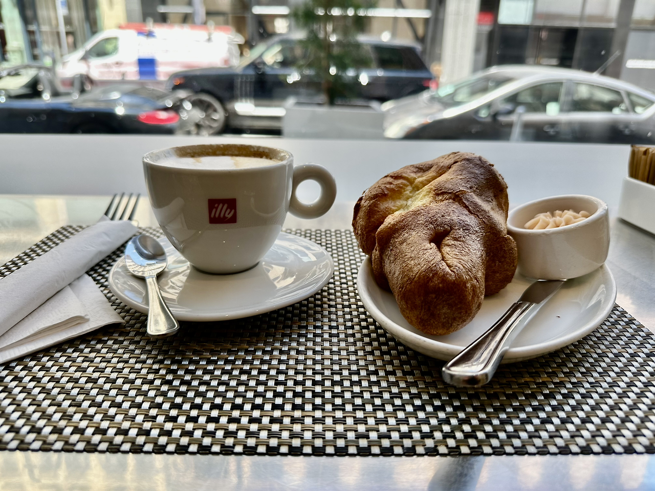 팔로알토에서 아침 7시에 문을 여는 프렌치 베이커리에서 맛본 초콜릿 크로와상과 카푸치노. 크로와상이 별로 기대 안 하게 대중적인 공장제품처럼 보이는데 의외로 아주 성의 있게 잘 만든 맛이다. 아주 섬세한 크러스트가 살짝 바삭거리고 속은 계란 버터맛이 가득하고 초콜릿은 텁텁하지 않다.