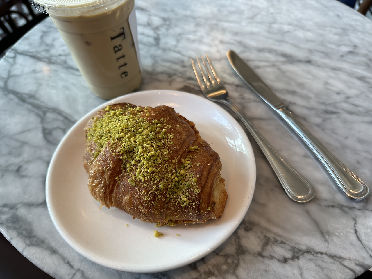 워싱턴 DC의 tatte bakery (타테 베이커리)에 들르니 내가 좋아하는 피스타치오가 들어간 메뉴가 있어 피스타치오 크로와상과 피스타치오 라테를 시켜봄. 여기 크로와상도 그저 그렇게 뻣뻣했고 라테는 그럭저럭 피스타치오 맛이 났지만 너무 달았다