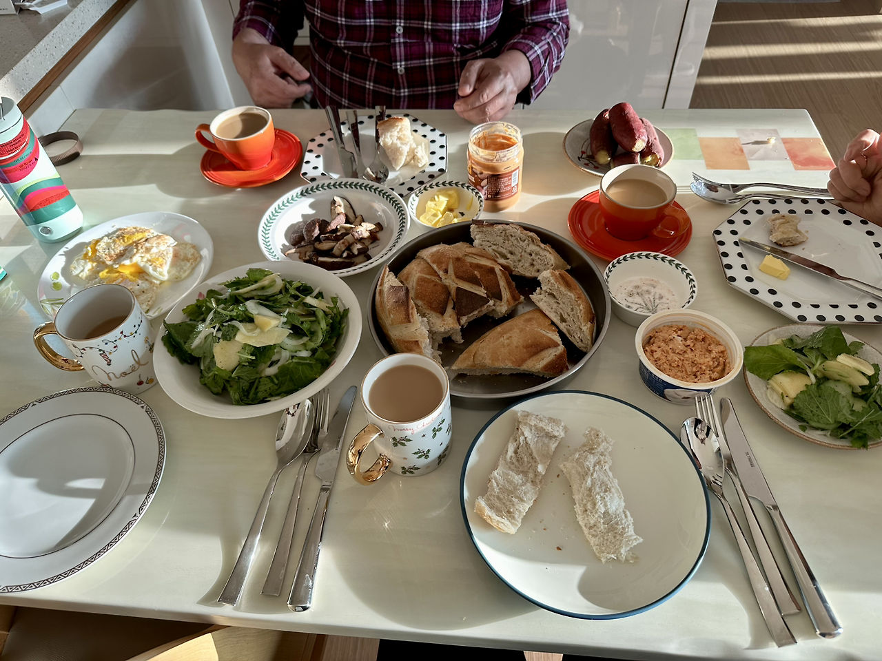 200도씨에 8분 구우면 겉은 더 바삭 속은 아주 쫄깃하고 부드러운 사워도우 완성품이 나온다. 가족들과 여러 스프레드, 샐러드, 계란을 준비하고 커피를 내려 어느 날 아침으로 먹었다.