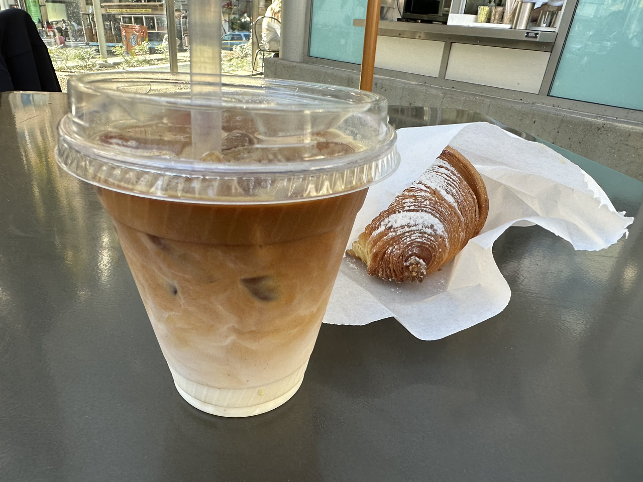 타히탄 바닐라 커스터드 크로와상과 아이스라테. 크로와상을 문 순간 뭔가 오래된 기름 향이 감돌고 빵은 매우 부석 했다. 겉의 바싹 구워진 모양과 슈거 더스트로 겉모습만 갖추었지 왜 이리 신선하지 않은 이상한 향이 나는지 의문이었다. 작은 크로와상인데 다 안 먹고 버렸음.