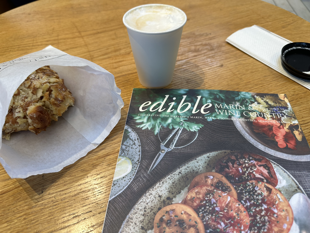 어느 날 근교의 티뷰론에 갔다가 그 고장의 베이커리인 Rustic bakery에 들러보았다. 커다란 아몬드 크로와상과 카푸치노를 시켜서 마린카운티의 좋은 식재료가 가득한 무료매거진과 시간을 즐겼다. 안타깝게도 이곳의 크로와상은 뭔가 먹기 힘든 느낌이었다. 안 촉촉하고 아몬드는 매우 많고 특별히 맛있지 않았고 카푸치노는 양이 너무 적었다.