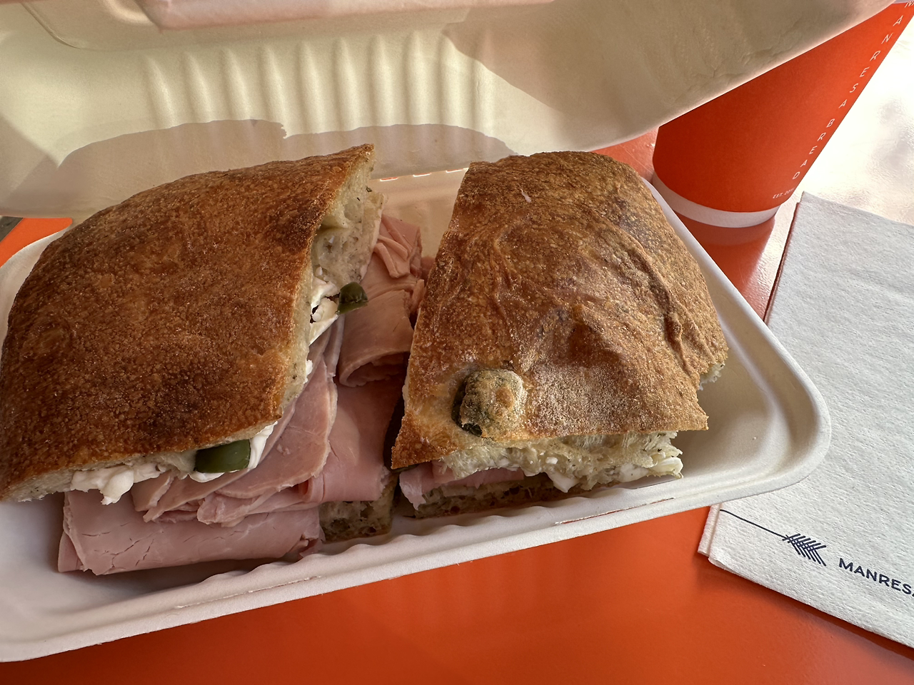 이 제품은 팔로알토의 만레사 브레드에서 내가 가장 좋아하는 잠봉뵈르다. 잠봉 퀄리티가 최고에 아주 많이 들어있고 버터는 흰 버터인데 충분히 발라져 있고 작은 피클이 머스터드와 함께 있다. 이 빵에 들어간 올리브는 통조림 올리브가 아닌 듯 아주 탱탱하고 사각거린다. 가격은 15달러인데 안에 들어간 잠봉의 양이 가격을 상쇄할 정도.