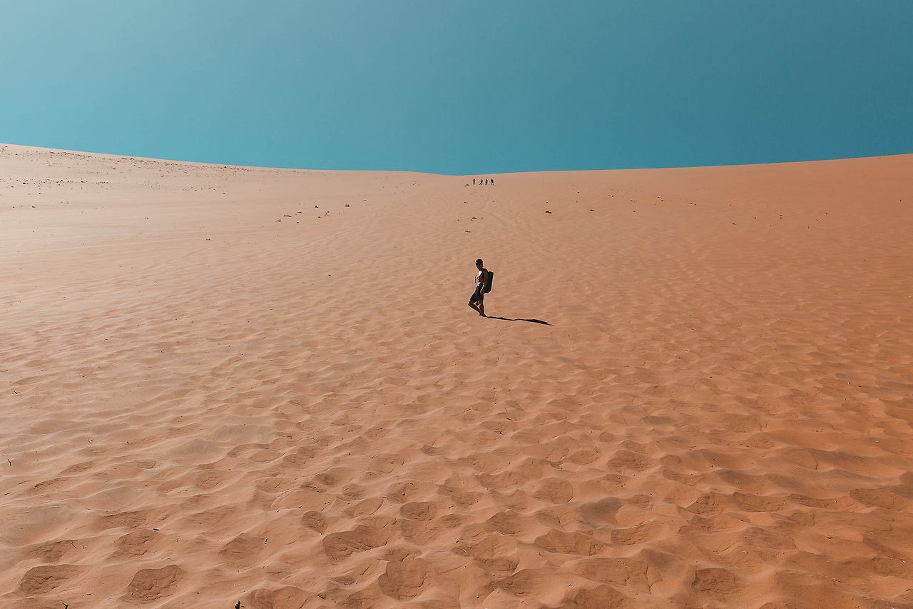 해가 다 오른 후 한참을 있다가 다음 목적지로 가기 위해 듄 45를 떠난다. 언덕 위까지 완만한 경사를 오랜 발걸음으로 도착한 여행자들 모두 내려갈 때는 가파른 곳으로 빠르게 미끄러져 내려간다. 어떤 이는 꺄- 꺄 소리를 지르며 내려가고, 어떤 이는 두 팔을 넓게 벌린 채 뛰어간다. 신기하게도 미끄러져 가다 보면 속도가 붙고 절로 소리가 나고, 두 팔을 벌리게 된다.