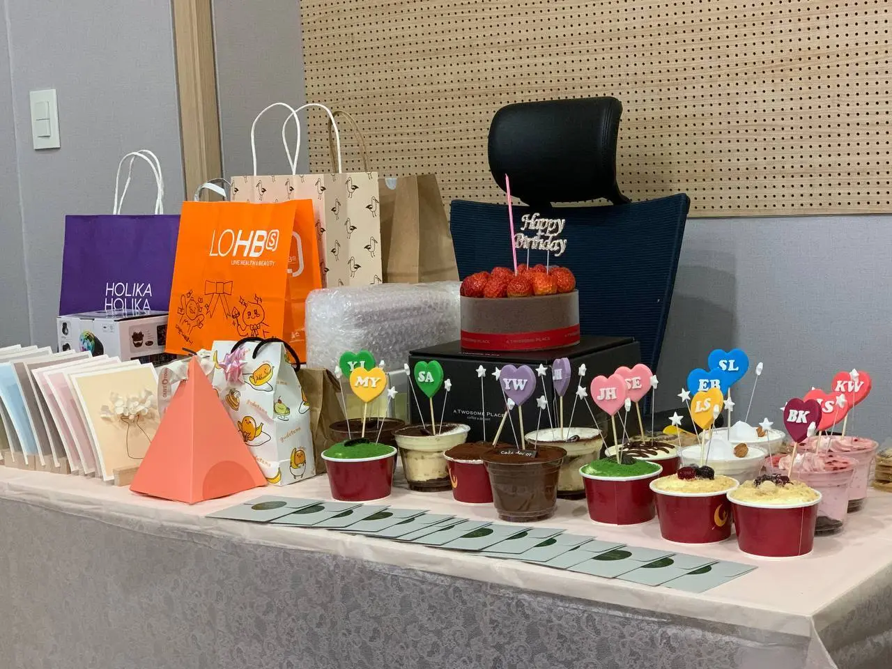 그리고 다 같이 케이크도 나눠먹고 선물 교환식에서 랜덤 선물 뽑기에서 나온 선물들도 함께 공유했습니다.