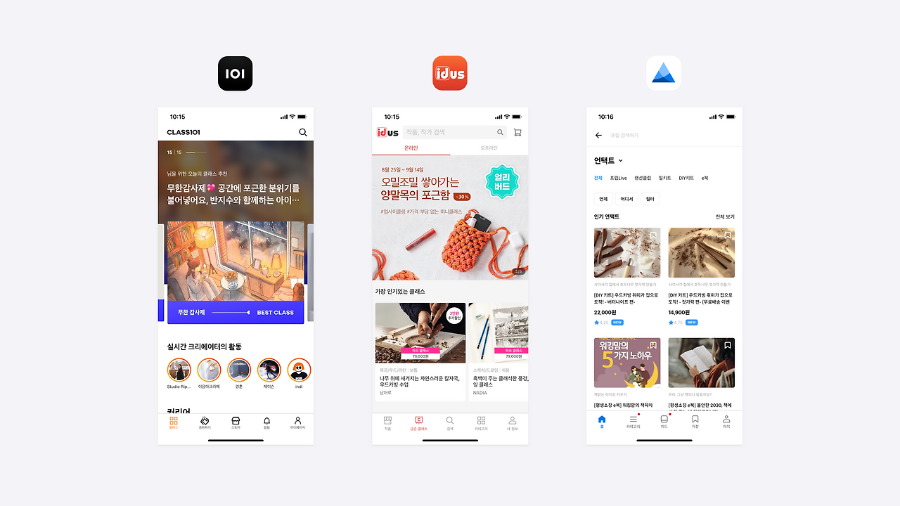 클래스 101은 이러한 서비스의 대표주자로서 UI 구성이나 UX의 측면에서 비교적 잘 정리되어있다고 생각한다. 이에 클래스 101과 핸드메이드 작가의 제품판매에서 클래스오픈까지 확장한 아이디어스, 취미 동호회 어플에서 언택트 클래스를 오픈한 프립을 비교분석하며 최적의 온라인 클래스 UI를 찾아보고자 한다.