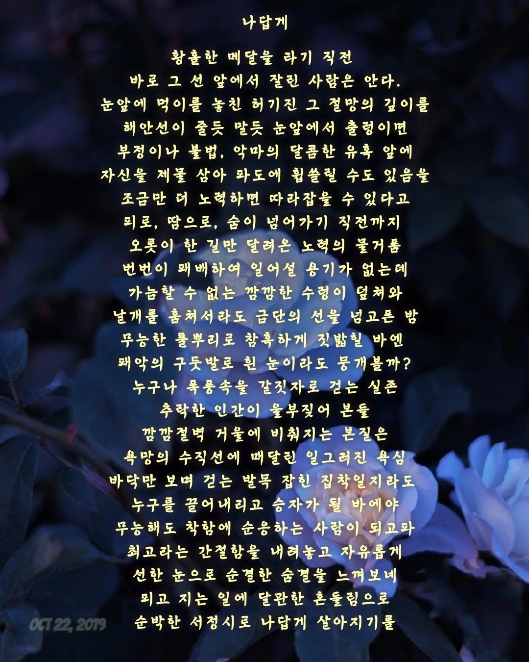 사람들의 이기심과 욕심을 견뎌내면서 나는 그들과 같은 삶을 살지 않겠다고 마음먹었다. 내 방식대로의 삶을 선택하기로 했다. 시를 통해 마음을 노래하면서 인내하는 삶이 나의 삶이라는 사실을 받아들였다.