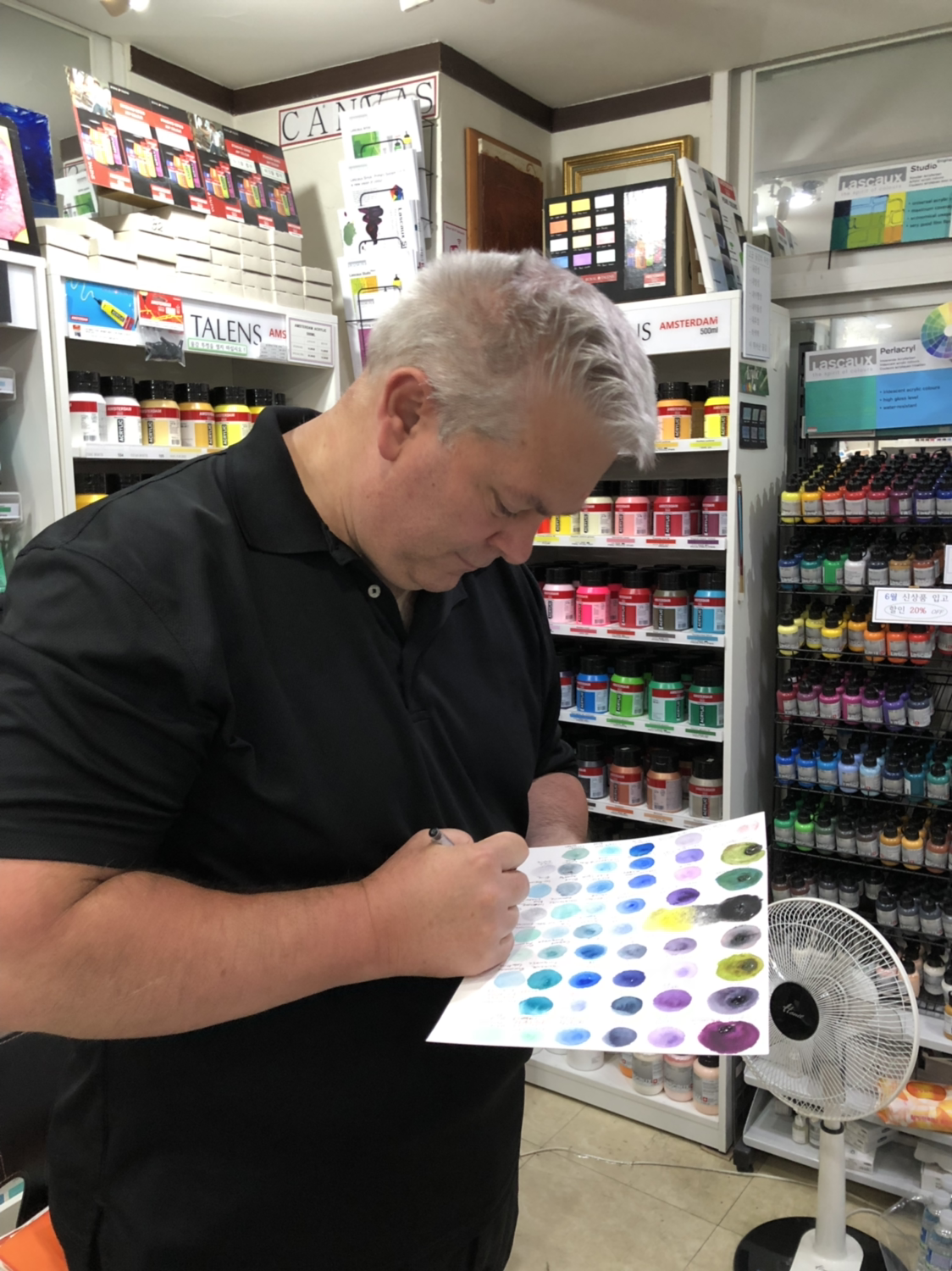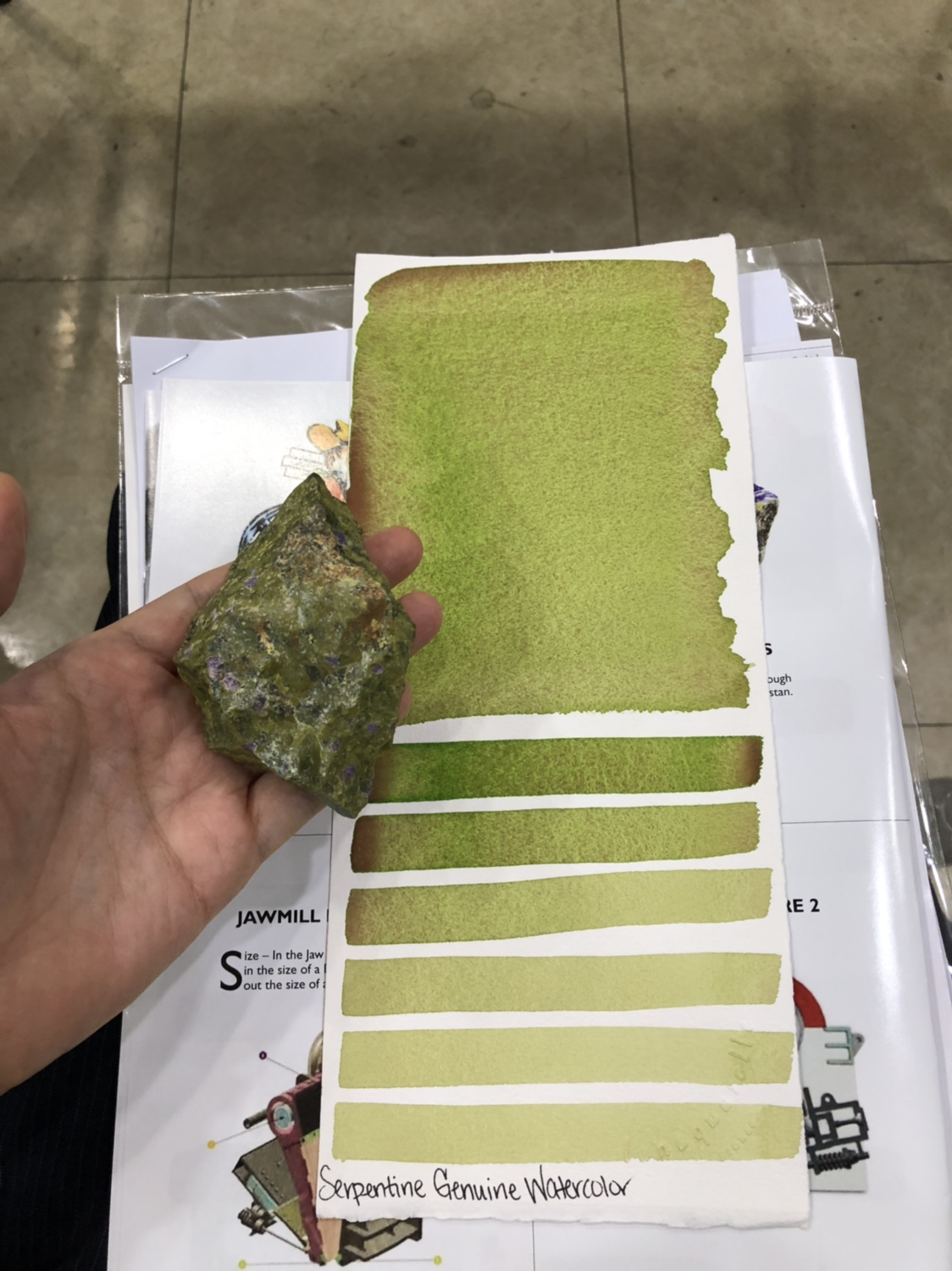 바로 오늘이 그 세미나가 있었던 날. 실은 나는 누가 오는지도 모르고 그저 고급 물감을 맘껏 사용해볼 수 있는 멋진 기회라는 생각에 참석을 했다. 가서보니 인사동에 있는 미림아트 사장님의 주최로 다니엘 스미스 대표이자 오너인 John Cogley씨가 직접 발표와 데모를 진행하는 자리였다. 조심스레 포장해온 광물들과 발색표를 꺼내어 놓고 물감 하나가 나오기까지의 전 제작과정을 가감없이 자세하게 설명해주었다. 간간히 질문도 받았는데 진지하게 대답해주는 모습이 매우 인상적이었다. 새로운 광물을 찾아가는 과정과 제작공정은 정말로 과학적이고 흥미로웠다. 사전지식이 많았더라면 더 많이 이해하고 질문도 했으련만. 그래도 통역해주시는 분이 쉽게쉽게 열심히 설명해주셔서 이해가 빨랐다.