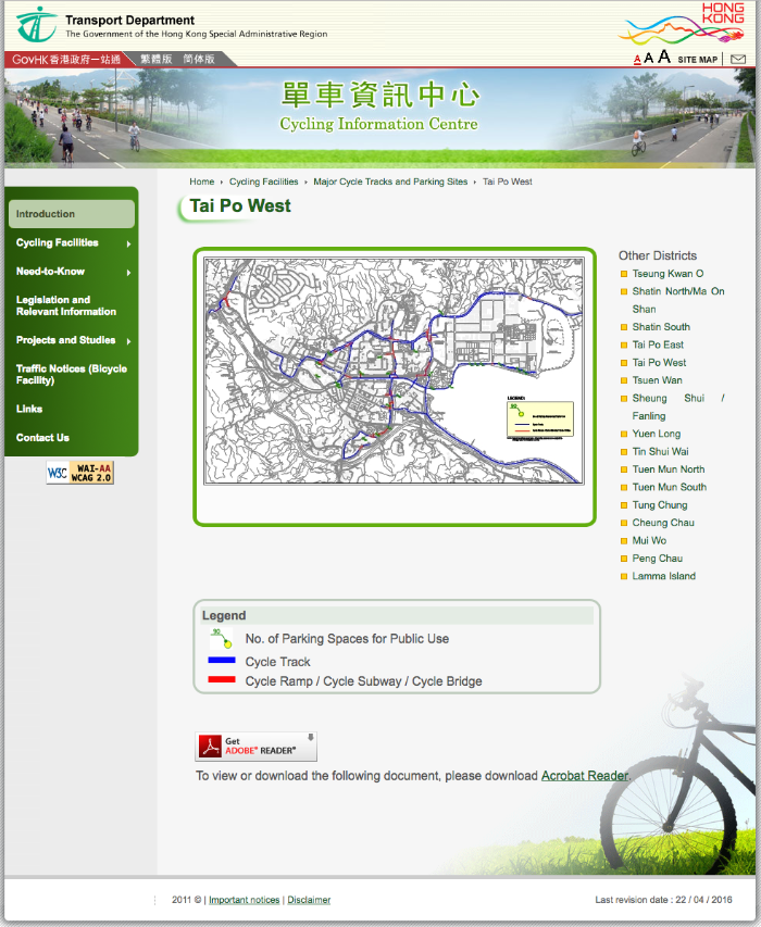 홍콩에서 자전거를 타기 좋은 곳은 따로 있다. 우리의 국토교통부 격인 홍콩 운전서(運輸署, Transport Department) 홈페이지에 들어가면, 각 지역에 조성된 자전거 트랙을 지도와 함께 상세히 볼 수 있다. MTB 마니아라면 지정된 공원 내의 MTB 트래일을 이용하는 것이 좋다.