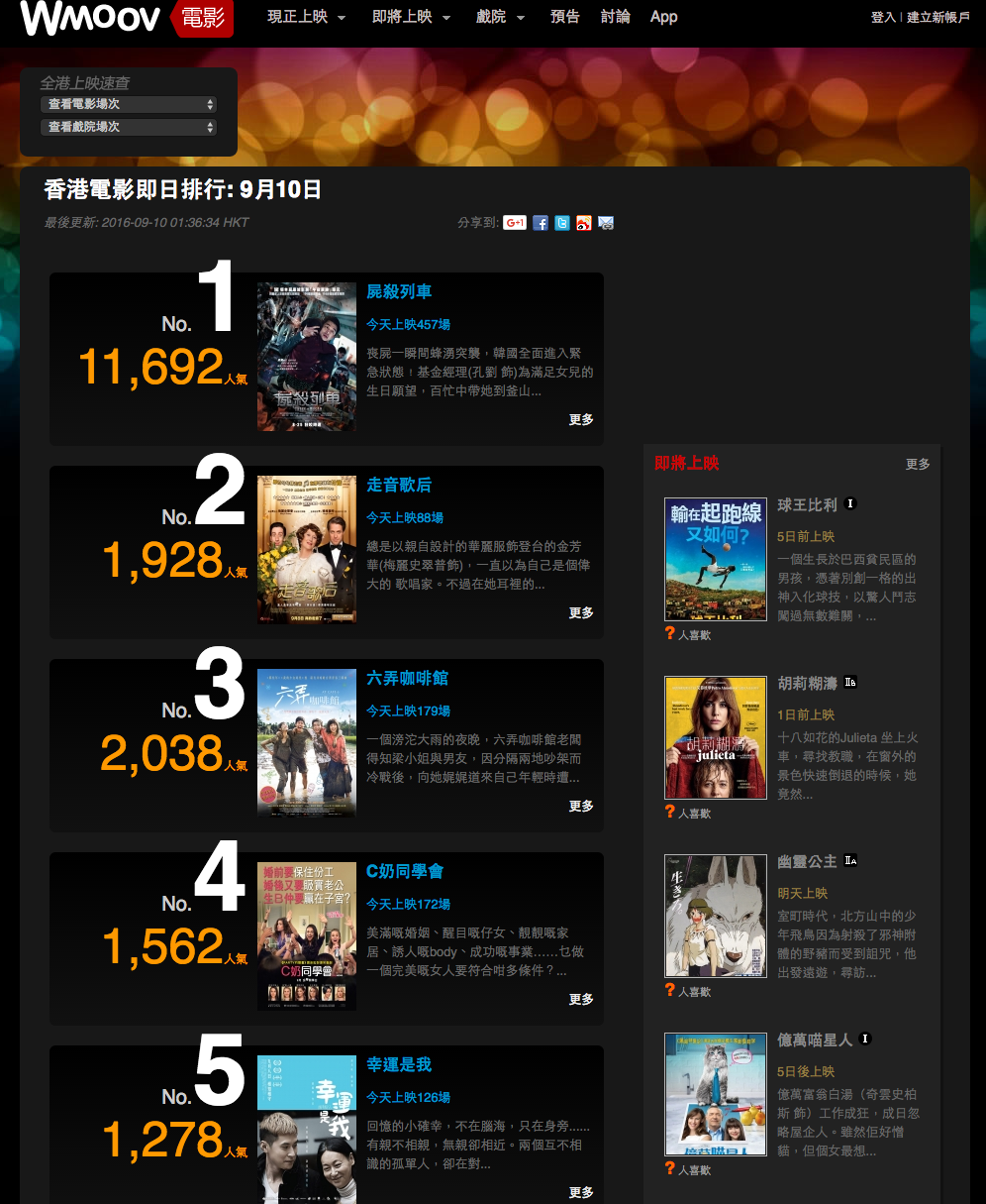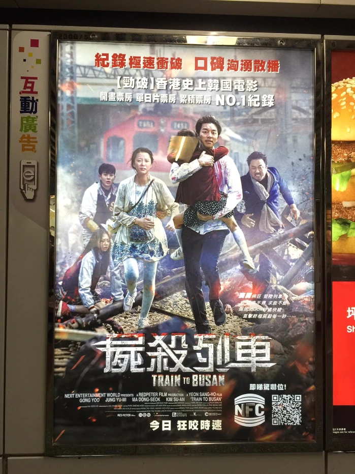 그렇게 홍콩 지하철역 곳곳에 우리 영화 《부산행》의 광고 포스터가 붙은 것을 보게 되었다. 영화의 내용을 전혀 몰라도 이 영화가 얼마나 긴박하고 처절할지가 배우들의 표정에 그대로 드러나는 듯했다. 포스터에는 "시체 살인 열차" 정도로 해석될 살벌한 홍콩식 타이틀 《屍殺列車》이 《Train to Busan》이라는 영문 타이틀과 함께 표기가 되어있다.