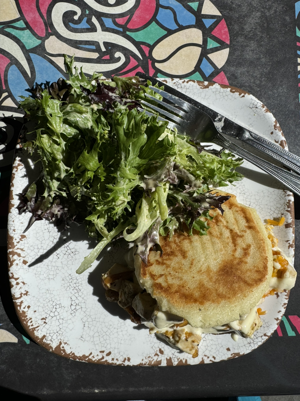 다음날 들러서 주문한 베네수엘라식 메뉴-치킨 아레파는 잉글리시 머핀같은 재질의 빵 속에 바베큐 치킨과 양파를 넣은 음식이었다. 햇살 쨍한 야외 테이블에 앉았다.