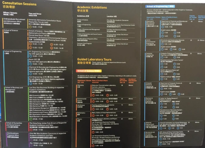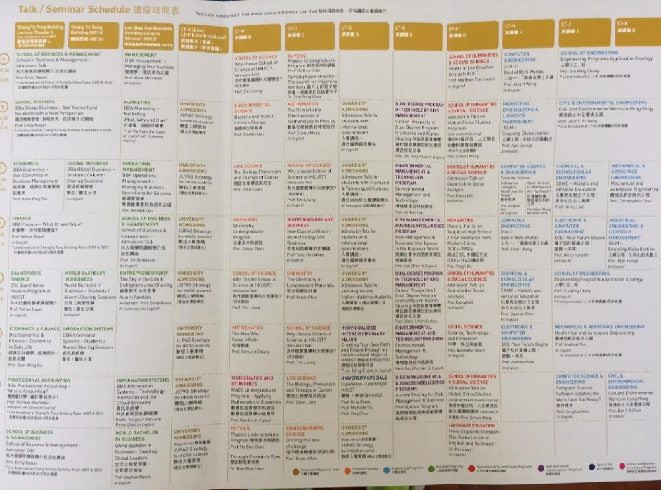 여기에는 각 학과별로 주최하는 전시회, 캠퍼스 및 연구실 투어 프로그램, 교수들의 전공 관련 세미나 스케줄 등이 정말로 빼곡히 담겨있었다. 국제화된 대학답게 영문과 중문이 혼용 표기되어있던 것도 눈에 띄었다.