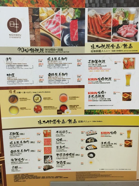 고기가 먹고 싶을 때는 주로 니치규 샤브샤브 전문점(日牛涮涮鍋專門店, Nichigyu)을 찾는다. 일인당 148 홍콩달러(한화 약 2만 원)로 90분 안에 일본 품종의 소고기가 무한 제공된다. 각종 야채도 뷔페식으로 푸짐하게 먹을 수 있다. 특히 한 사람당 하나씩 개인용으로 사용하도록 핫팟(Hot Pot)이 제공된다. 기본적인 육수 여섯 가지 종류 중에 하나를 고를 수 있는데, 이 중에 스파이시 미소(Spicy Miso Soup)는 우리나라의 얼큰한 된장 국물 정도의 맛을 낸다. 매운맛이 그리운 한국인들에게 특히 인기가 좋다. 커피나 소다와 같은 음료는 물론 프로즌 요거트(Frozen Yogurt)도 포함되어 있다. 워낙 가성비가 좋아서 손님들이 가게 영업이 시작되는 정오보다 훨씬 일찍 와서 줄을 선다.