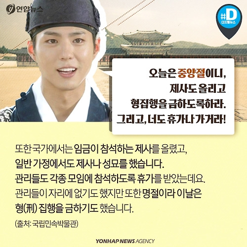 홍콩은, 크리스마스 연휴 전, 올 해의 마지막 공휴일인 음력 9월 9일 중양절(重陽節, Chung Yeung Festival)을 맞이했다. 홍콩 사람들에게는 이날 성묘하는 풍습이 남아있다. 최근에 드라마 '구르미 그린 달빛'에서 소재가 되었듯이, 과거에는 우리나라에도 중양절을 기리는 각종 세시풍속이 있었다고 한다.