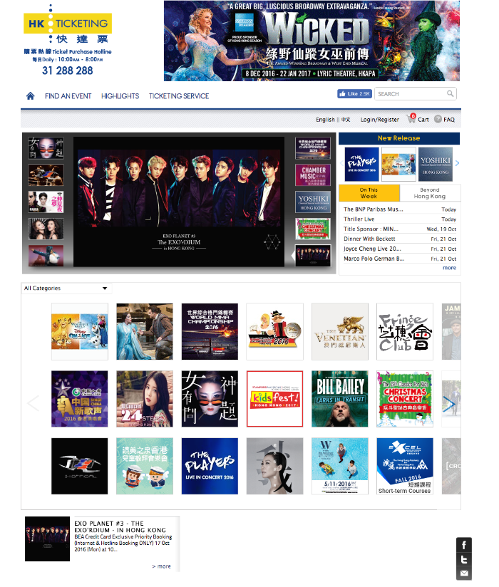 보통 온라인으로 공연 티켓을 구입하게 되면 HK Ticketing이라는 웹사이트를 이용하는데, 이 사이트에서는 홍콩에서 열리는 서양의 뮤지컬과 차이니즈 오페라뿐만 아니라 댄스나 공연, 전시 그리고 스포츠를 아우르는 대부분의 티켓을 판매한다. 이 곳의 하이라이트(Highlights) 메뉴에 엑소(EXO)의 홍콩 콘서트 일정이 소개되었다. 2017년 2월 11일과 12일 양일간 열리는 엑소의 콘서트 티켓도 이른 판매를 시작했다.