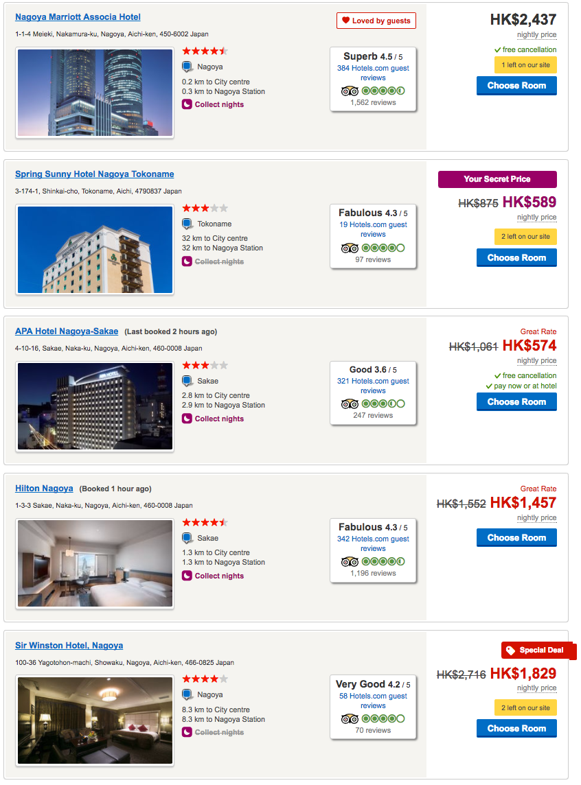 우선 나고야 역에서 가장 가깝고 프로모션 가격을 제공하며 게스트의 리뷰가 좋은 호텔을 위주로 찾았다. Hotels.com에서의 검색을 통해 쭉 훑어보니 꽤 괜찮은 호텔들이 보였다. 필자는 여행 중에 호텔방에서 오래 머물러 있는 성격이 아닌지라 방의 구조나 사이즈에는 큰 관심이 없다. 교통이 편리하고 호텔 주변 편의성이 좋은가에 모든 초점을 맞추는데, 대부분의 경우에 그럭저럭 만족스러운 선택을 하는 편이다. 아. 그리고 웬만하면 글로벌 브랜드가 아닌 현지 브랜드의 숙소를 이용한다. 여행자로서 그곳의 경제에 조금이나마 도움을 주는 게 좋을 것 같아서.