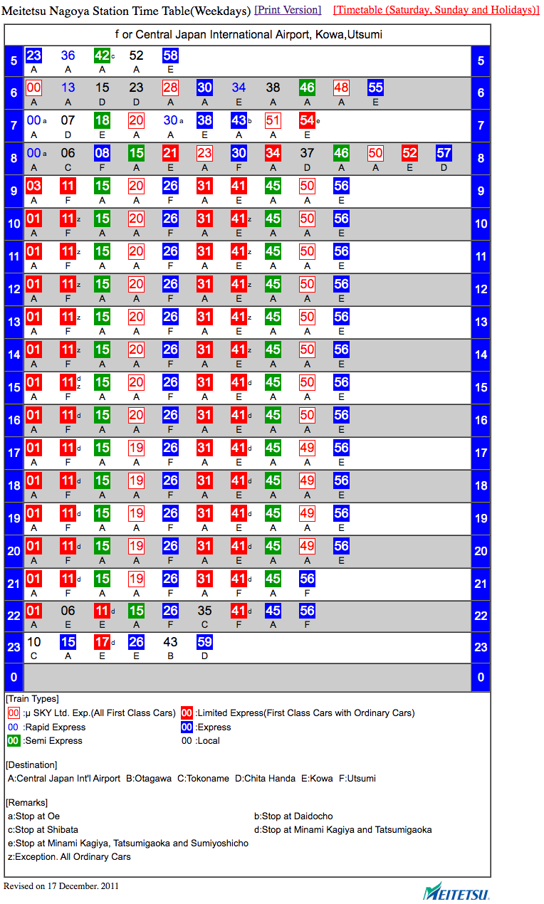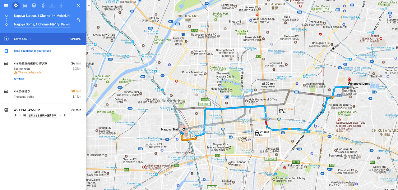 나고야 중부국제공항과 나고야 역은 나고야 철도(메이테쓰)를 이용하면 870엔에 단 28분 만에 도착할 수 있는 거리로써 나고야 시티 센터로의 연결도 잘 되어 있다고 한다. 또한 나고야 시내 중심지와 나고야 역 사이의 거리가 매우 가깝다는 것도 만일의 경우 나고야를 벗어나 다른 도시(오사카나 교토)로 이동하게 되더라도 기차를 타는데 큰 불편이 없을 것으로 예상되었다. 경기 날짜가 3월 12일이기에 벚꽃을 구경하기는 조금 이른 시기이지만 그래도 혹시나하고 기대가 되기에, 나고야 시내에서 천천히 걸어 다니며 근처의 관광지나 나고야 성 등의 유적지를 관광하기로 대략적인 동선을 잡았다. 이제 시내에서 머물 숙소의 위치가 얼추 정해졌다.