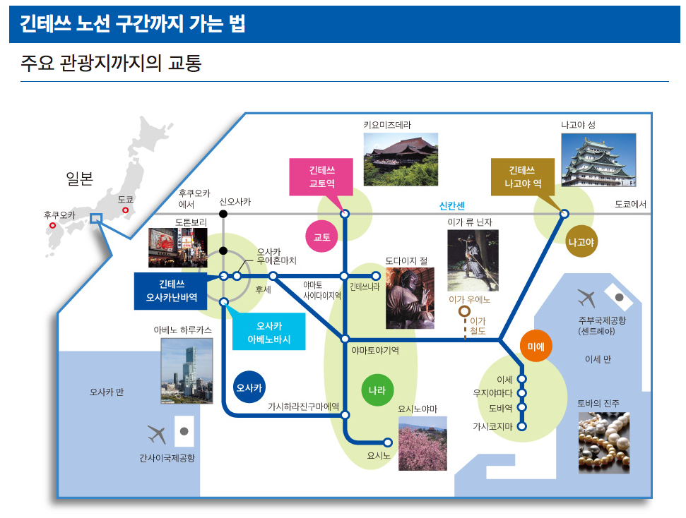 또 나고야 근처에 있는 다른 도시에 나가게 된다면 어떤 선택이 있을까 싶어 알아보니 긴테쓰 레일패스(외국인 여행자 한정 주유 패스)를 이용하면 오사카-나라-교토-이세시마-나고야를 다닐 수 있는 긴테쓰 전차(또는 킨테츠 레일웨이/Kintetsu Railway)로 5일간 자유롭게 승하차할 수 도 있다고 한다. 5일권 이외에도 오사카-나라-교토를 갈 수 있는 1일권과 2일권이 있다. 일본에 가기 전에 미리 구입하면 조금 싸긴 하지만(2017. 3 홍콩 익스프레스 기내에서도 할인된 티켓을 판매하고 있었다), 필자는 현지에 가서 좀 더 세밀한 여행 일정이 확보된 후 구입하기로 했다.