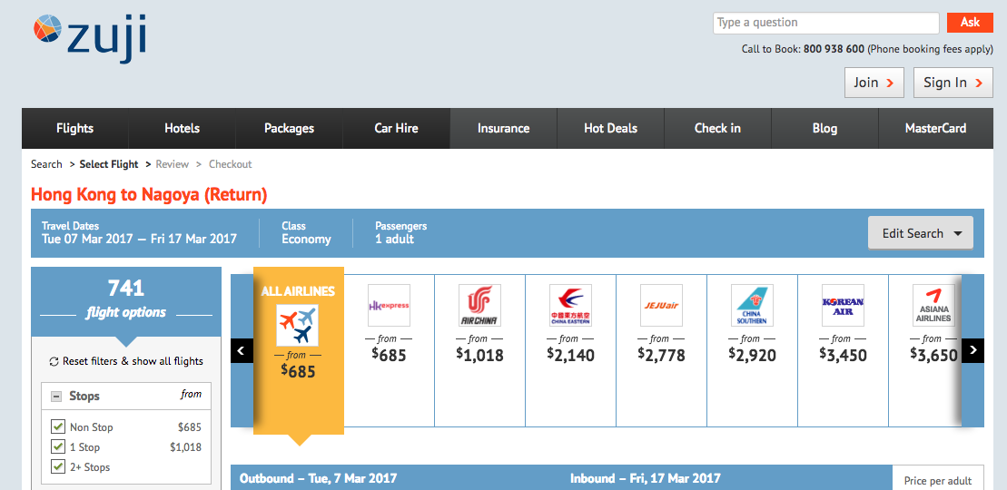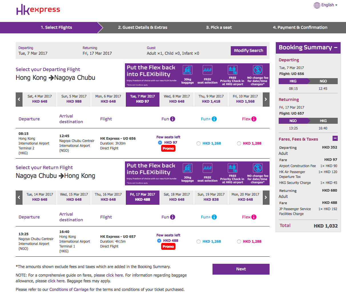 홍콩에 살면서 좋은 점 중 하나는 해외여행 갈 때 저렴한 비행 티켓을 손쉽게 구할 수 있다는 것이다. 아시아의 무역 중심답게 세계 어디로든 매일 들고나가는 비행 편 수가 아주 많다. 필자는 여행지가 결정되면 주로 주지닷컴(Zuji.com)을 통해 그 시기의 전체적인 티켓 가격대를 알아보거나 저가항공 웹사이트를 통해 알아보는 편이다. 최근에 저가항공사들이 많이 늘어서인지 서로 가격 경쟁이 치열하다. 그중 홍콩 익스프레스(Hong Kong Express) 항공이 요즘 한창 파격적인 가격으로 2017년 상반기 모든 노선의 비행 티켓을 프로모션하고 있다. 이 항공사를 이용한다면 홍콩에서 나고야로 가는 최저 편도요금이 무려 홍콩달러 97원(한화 만 오천 원, 세금 별도)이다. 정말 저렴하다!