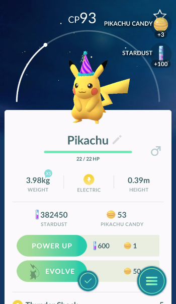 피카추가 크리스마스 시즌 이후로 다시 한번 특별한 모자를 쓰기 시작했다. 포켓몬 21주년 기념으로 2월 26일부터 3월 6일까지 피카추는 귀여운 파티 모자를 쓰고 출현을 할 예정이란다. 포켓몬고를 업데이트하고 피카추가 어서 나오길 애타게 기다린지 이틀째. 드디어 CP93의 자그마한 피카추가 몽콕 근처에서 눈에 띄었다. 2세대 포켓몬들이 등장한 이후 주요 서식지에 대변동이 생겨서 아직 그 흐름이 제대로 파악되지 않고 있다. 그래서 피카추 역시 어디에 가면 나올른지 감이 잡히지 않는 상황이다. 그런데 이렇게 갑자기 마주하니 정말 반가웠다. 간단하게 포획 완료! 모자 쓴 피카추를 진화시킬 수 있는 캔디가 넉넉하게 있긴 하지만 달콤한 순간을 조금 더 아껴두기로 했다.