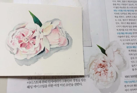 어느 날 여성잡지의 한 면에 피어있는 꽃이 하도 예뻐서 그것도 그림으로 옮겨두었다. 그림으로 그리면서 사진과 100% 똑같이 그려야겠다는 생각을 하진 않는다. 다만 내가 아름답다고 느꼈던 그 느낌을 그대로 살려보고자 하는 노력을 기울인다. 전문적인 테크닉이 없기에 그 좋은 느낌을 충분히 살리려면 어떻게 채색하면 좋을지를 붓을 들기 전부터 많이 생각하게 된다. 그래서 나 홀로 그림을 배우는 과정은 한 계단 한 계단을 온전히 내 힘으로 밟아가는 느낌이다. 마라톤을 해본 입장에서 그것과 비슷하다고 감히 말하고 싶다. 그림실력도 생각의 힘과 함께 자라나고 있다고 믿는다.