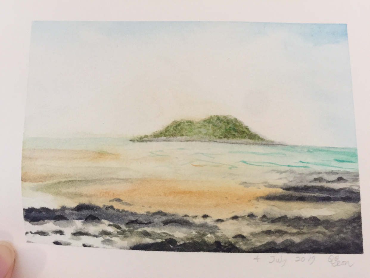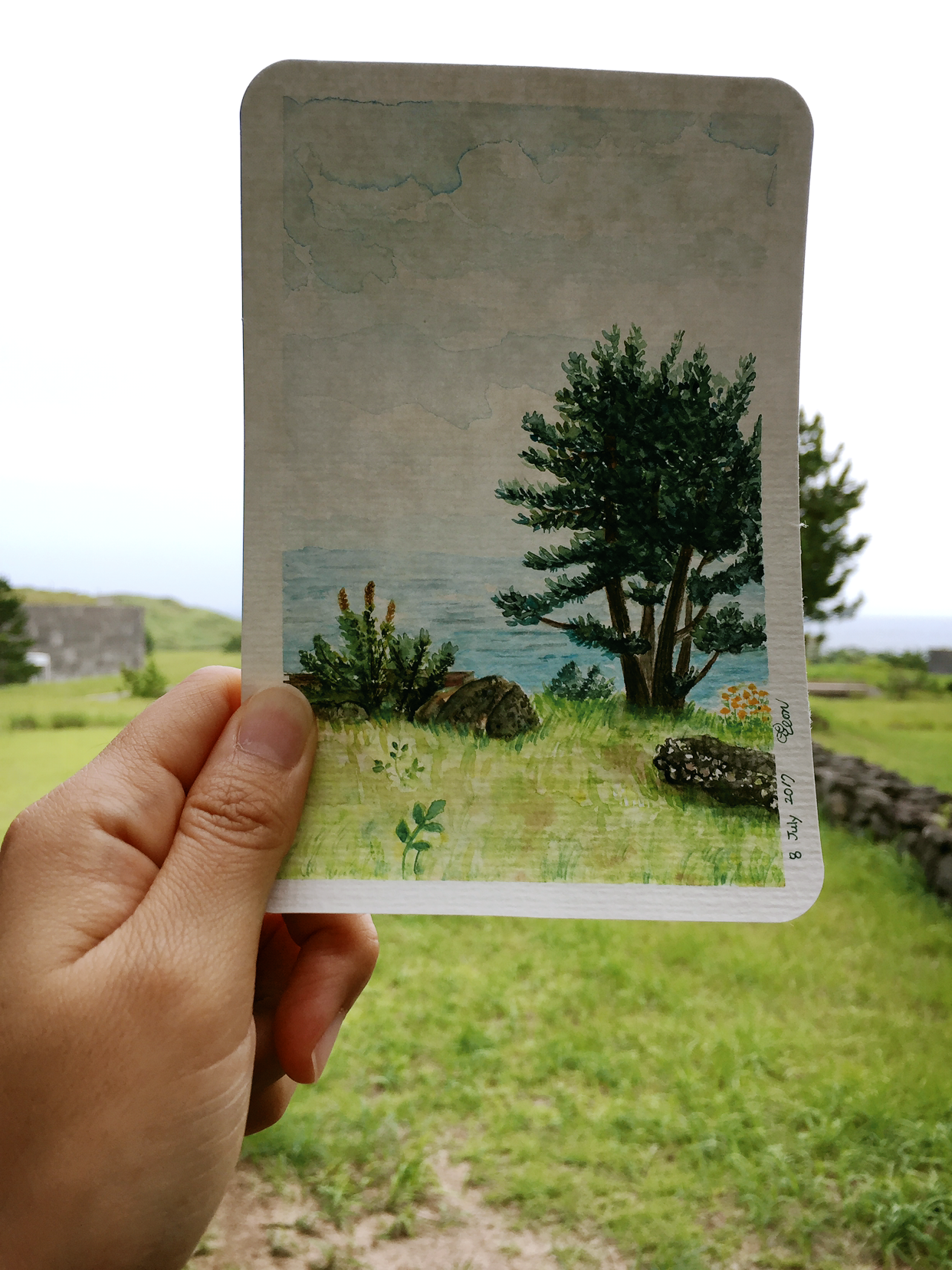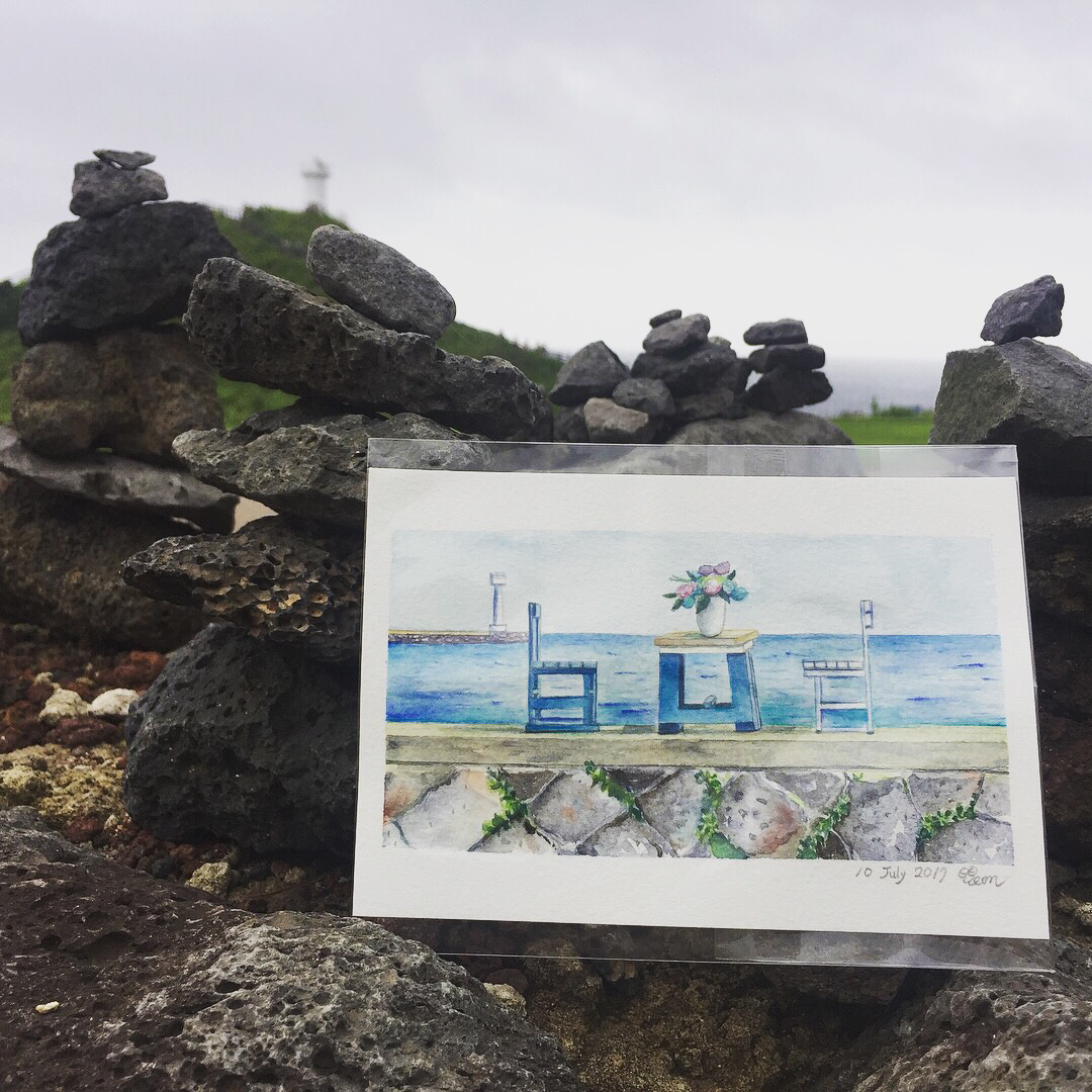 가볼 곳도 많고 찾는 사람도 많은 제주이기에, 내마음대로 어디를 그려도 제대로 그림다워보인다. 야외에 나가서도 관광객들이 모여있는 곳을 살짝 벗어난 자리에서 스케치없이 바로 물감을 사용해 그림을 그렸다. 인스타그램인가 어디에서 본대로 완성된 그림을 실제 보이는 풍경에 올려보니 신기하게도 원래 퍼즐의 한 조각인양 딱 맞춰진다.