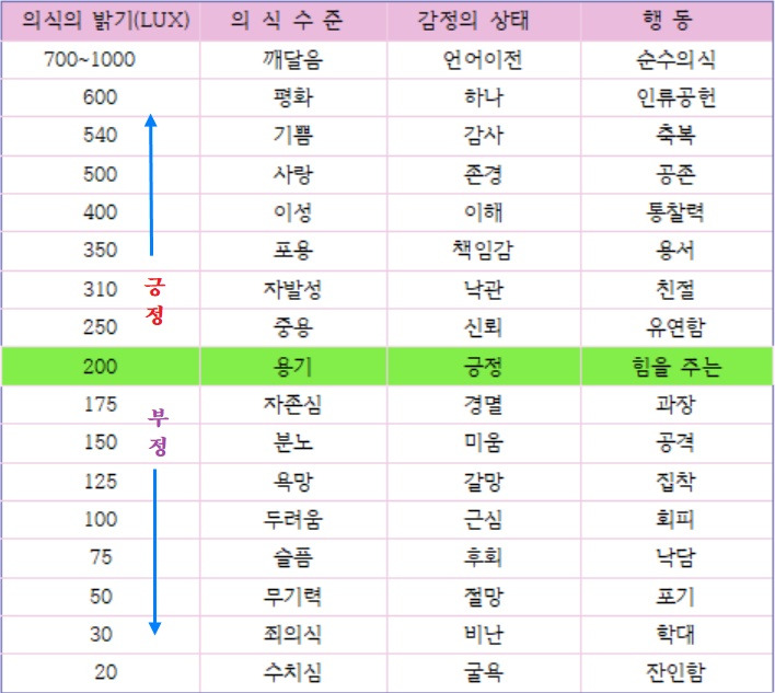 ‘데이비드 호킨스(David R. Hawkins)’ 박사의 <의식 지도>에서 성장의 길에 들어서는 가장 중요한 단계가 바로 ‘용기’ 수준 단계이다. 억눌린 내면 아이가 해방되지 못하고 갇혀있을 우리의 의식 수준은 겉으로 아무리 포장을 하고 감추어도 바닥 수준을 면치 못한다.
