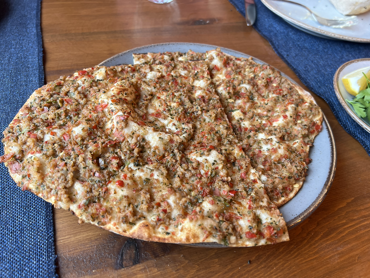 자리에 앉자 큰 쟁반에 작은 여러 개 위에 여러 가지 애피타이저들이 담겨 있었다. 직원이 우리 보고 고르라고 했다. 혹시 몰라 한 접시만 골랐는데, 접시를 고른 만큼 가격이 매겨지는 것이다. 식전빵과 같이 먹기에는 맛있었다. 양고기 케밥, 피자, 라마쿤을 주문했다. 개인적으로 음식에 향이 강해서 조금씩 먹고만 말았다. 나는 식전빵을 아주 맛있게 먹었다.