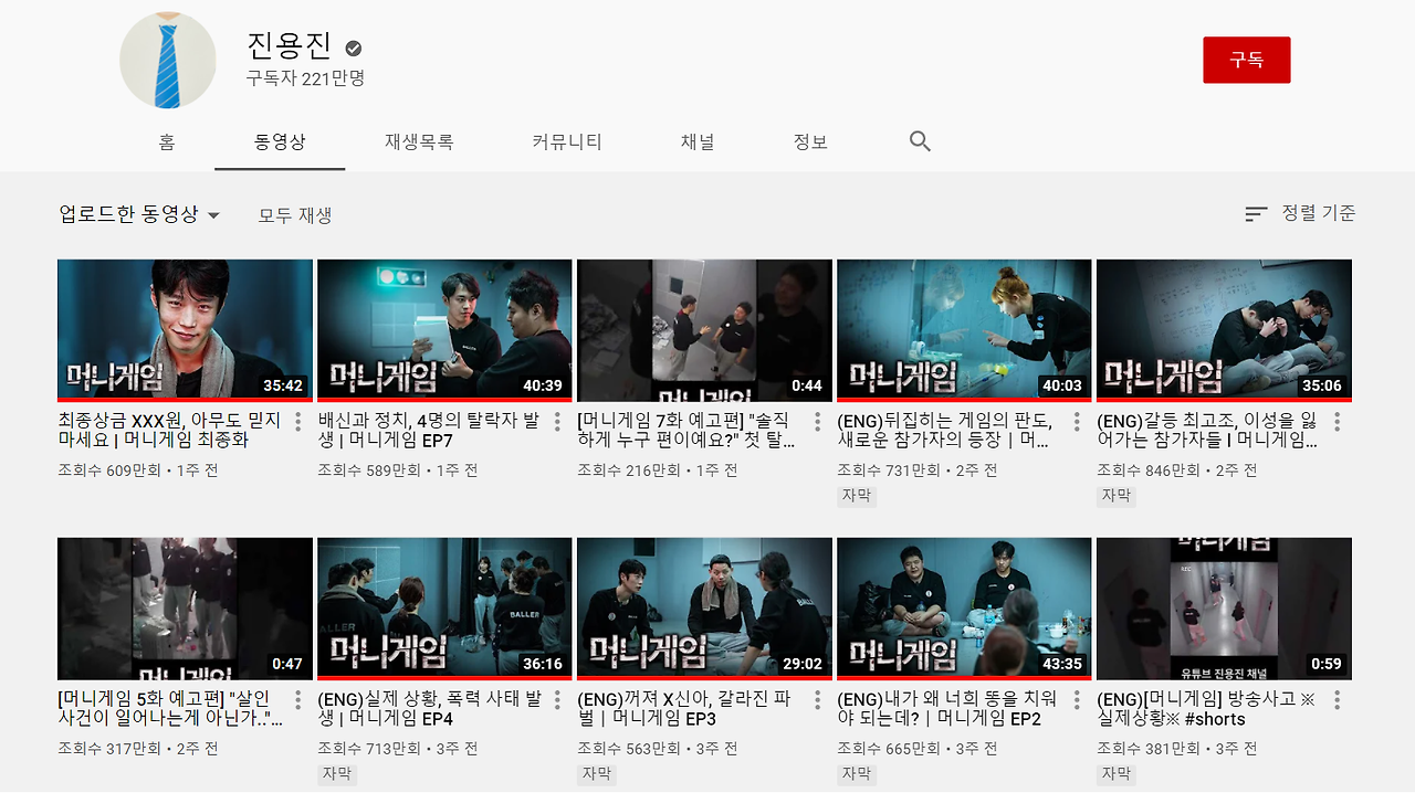 웹 예능 머니게임 (출처 : 유튜브 채널 '진용진') 총 8부작인 머니게임은 동명의 네이버 웹툰 작품을 소재로 촬영한 웹 예능 시리즈물이다. 돈이 절박한 사람들이 아무것도 없는 정체불명의 공간에 갇혀서 100일 동안 생존게임을 벌인다. 최후에 남은 사람은 총 상금 448억 원을 차지한다. 살아남는 데 필요한 물건은 각자의 방 안에서 인터폰을 통해 주문할 수 있다. 단, 물건의 가격은 무려 바깥세상의 1,000배에 달한다. 생활용품을 구입한 만큼 총상금에서 차감한다. 돈을 적게 쓸수록 많은 금액을 챙길 수 있다. 유튜브 버전은 참가자 8명이 총 상금 4억 8천만 원을 걸고 14일 동안 생존하는 내용이다. 물가는 100배를 적용한다. 마지막까지 쉽게 버틸 수 있을 것 같지만 생각만큼 간단하지 않다.