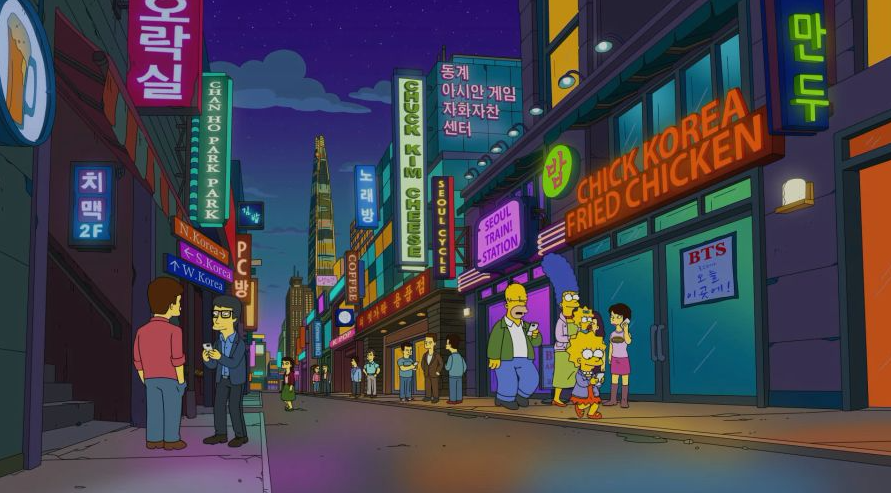 잠깐 위 장면 좀 같이 볼까요. 2019년 방영된 심슨가족 시즌 30의 17번째 에피소드 'E my sports'입니다. 아들 바트가 게임 국제대회 출전 자격을 얻는 바람에 심슨가족이 한국에 방문하는 이야기입니다. 롯데타워가 보이는 저곳은 혹시 방이동 먹자골목? 신천동 번화가일까요?