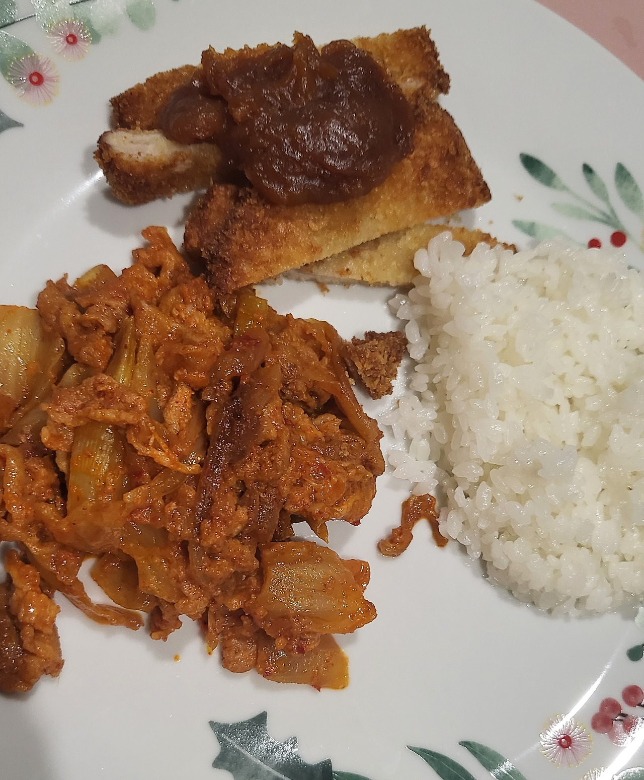 지난번에 먹고 아주 조금 남은 돈가스와 제육볶음 같이 해서 기사식당처럼 먹었다. 한 끼 식사 뚝딱!