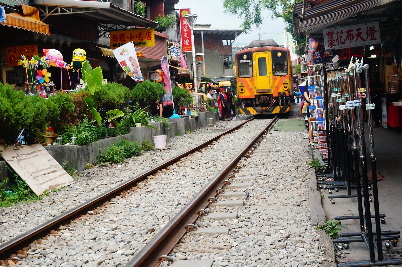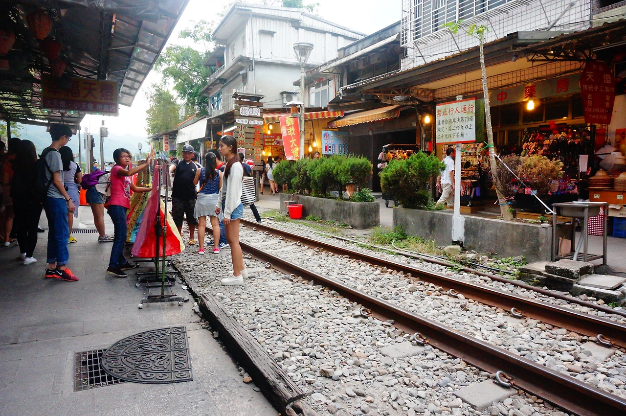 작은 마을 입구로 들어서면 기찻길이 마을을 양쪽으로 가르고 철길 양옆으로 천등을 파는 작고 예쁜 상점들이 옹기종기 모여 있다. 상점 밖에서는 천등에 글씨를 적고 있는 여행객들이 이색적인 모습을 연출하며, 철길에는 하늘로 천등을 날리려는 사람이 가득했다.