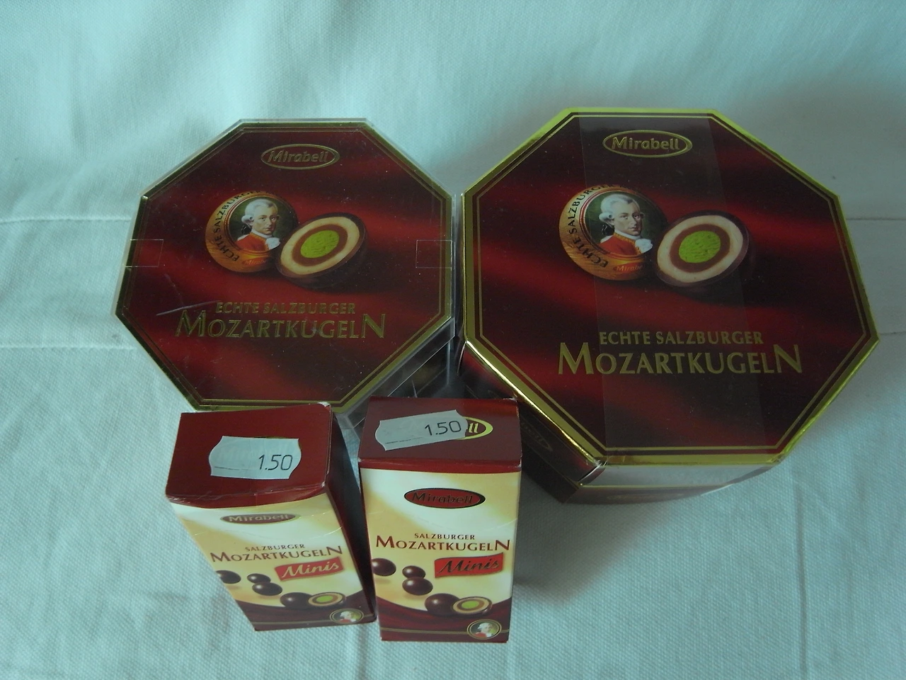 기념품 중에서 단연 눈에 띄는 것은 초콜릿이다. 모차르트 초콜릿은 잘츠부르크를 대표하는 특산품이라고 할 수 있을 정도로 유명하다. 초콜릿 종류도 많고, 초콜릿을 담은 케이스 모양도 다양한데, 가지각색의 초콜릿 케이스는 그 자체로 훌륭한 기념품이다. 케이스에 모차르트 얼굴을 그려놓은 것, 비올라나 바이올린 모양을 한 것, 필통모양이나 하트 모양에 이르기까지 다양한 케이스가 모차르트 초콜릿을 담고 있다. 가장 유명한 것은 육각형 모양 케이스에 담긴 미라벨(mirabelle) 초콜릿으로, 동그란 초콜릿 볼 안에 산뜻한 민트가 들어 있어 달콤하면서도 향긋한 풍미를 준다.